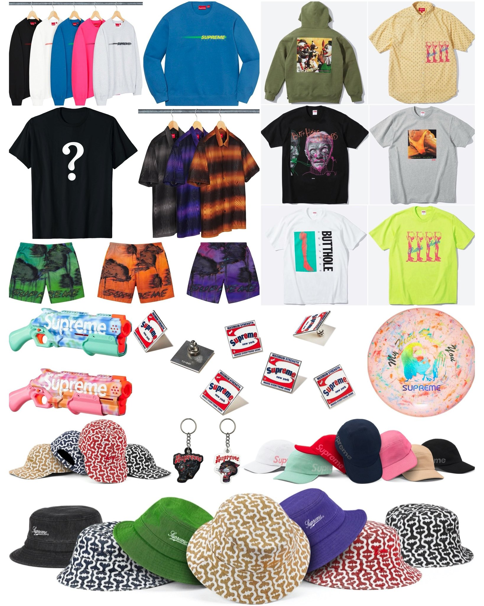 Spring / Summer Week 19 has some collabs from the likes of Nerf, famous psychedelic/rock outfit Butthole Surfers and Frisbee inventors Wham-O. The Nerf water guns are by far the most popular item dropping. The frisbee comes in second and the Butthole Surfers apparel is scattered among some original Supreme items. We recommend the Nerf water gun and holding if you have any plans of grabbing something to flip. Good luck!