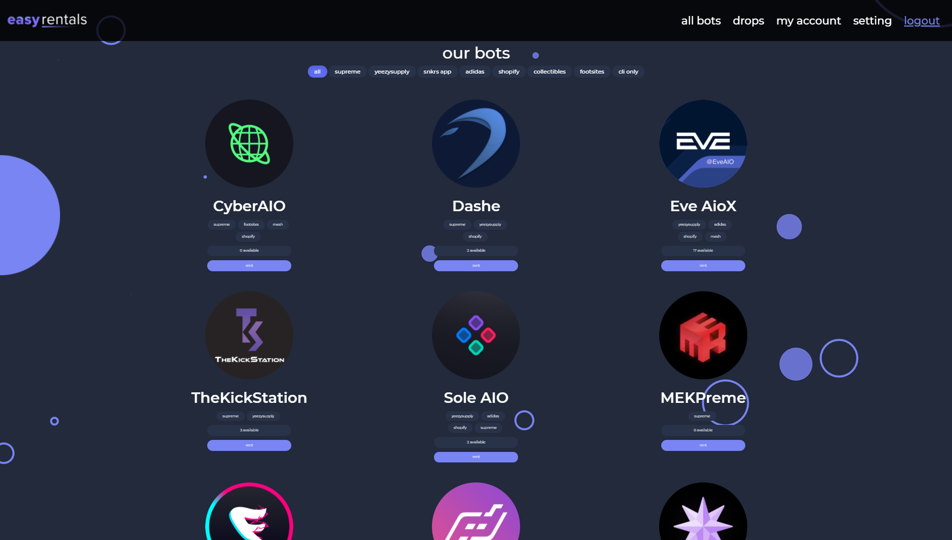 On this page you can view all the bots available to purchase. All the bots are broken down into the companies logo, the name of the bot, what they support, how many of the rentals are available and the rent button that will take you to their individual page to see the rentals available to purchase.