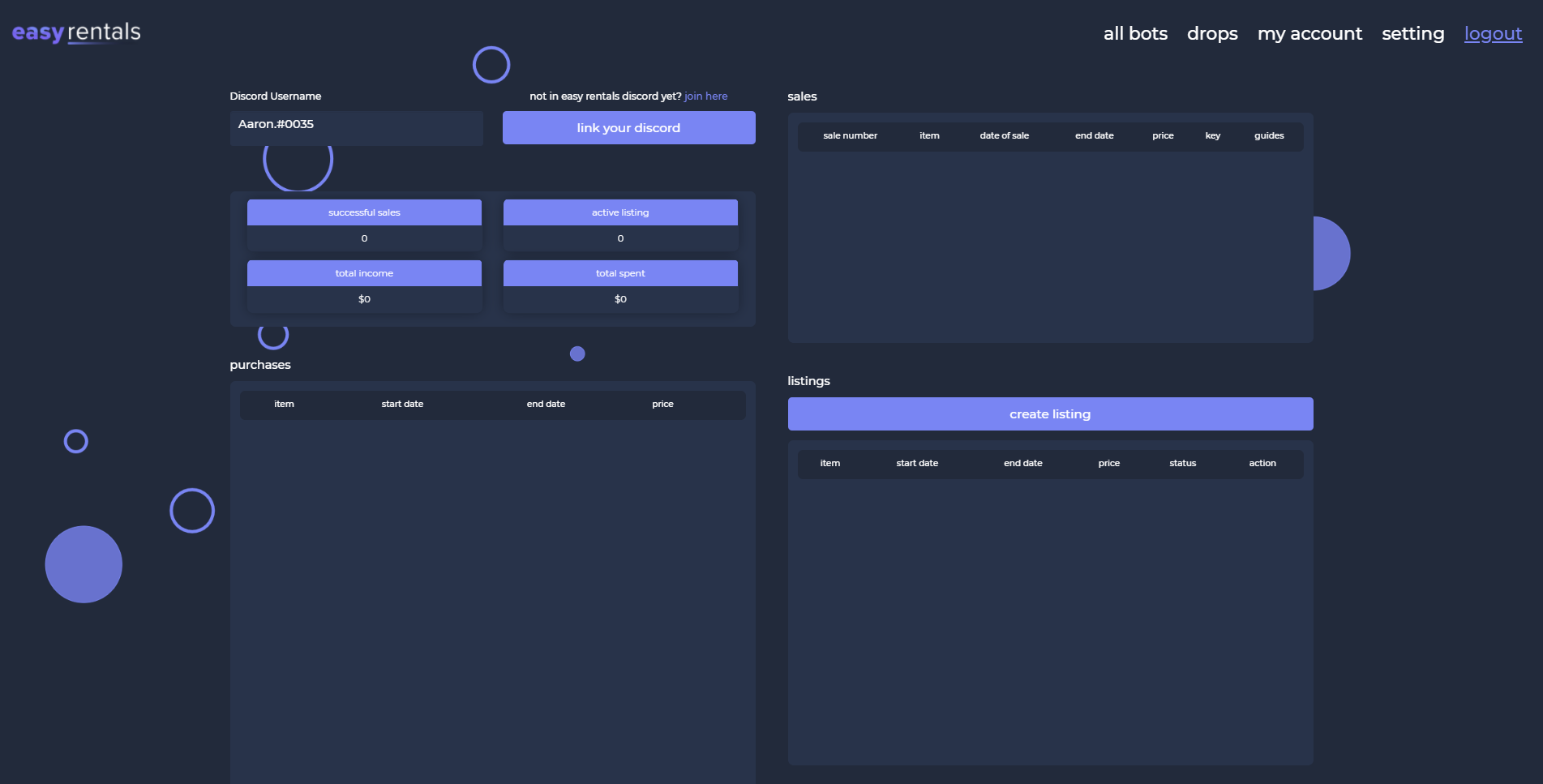 On this window the user can view an entire account overview that show off every aspect of the site. Firstly on the left side you can view your connected discord username with the option to link your discord on the right. Below that you can view some general statistics about your activity on the site such as successful sales, active listings, total income and total spent. On the right side you can view the sales made and below you can view the listings as well as create a listing. Finally, you can also view your purchases as well.