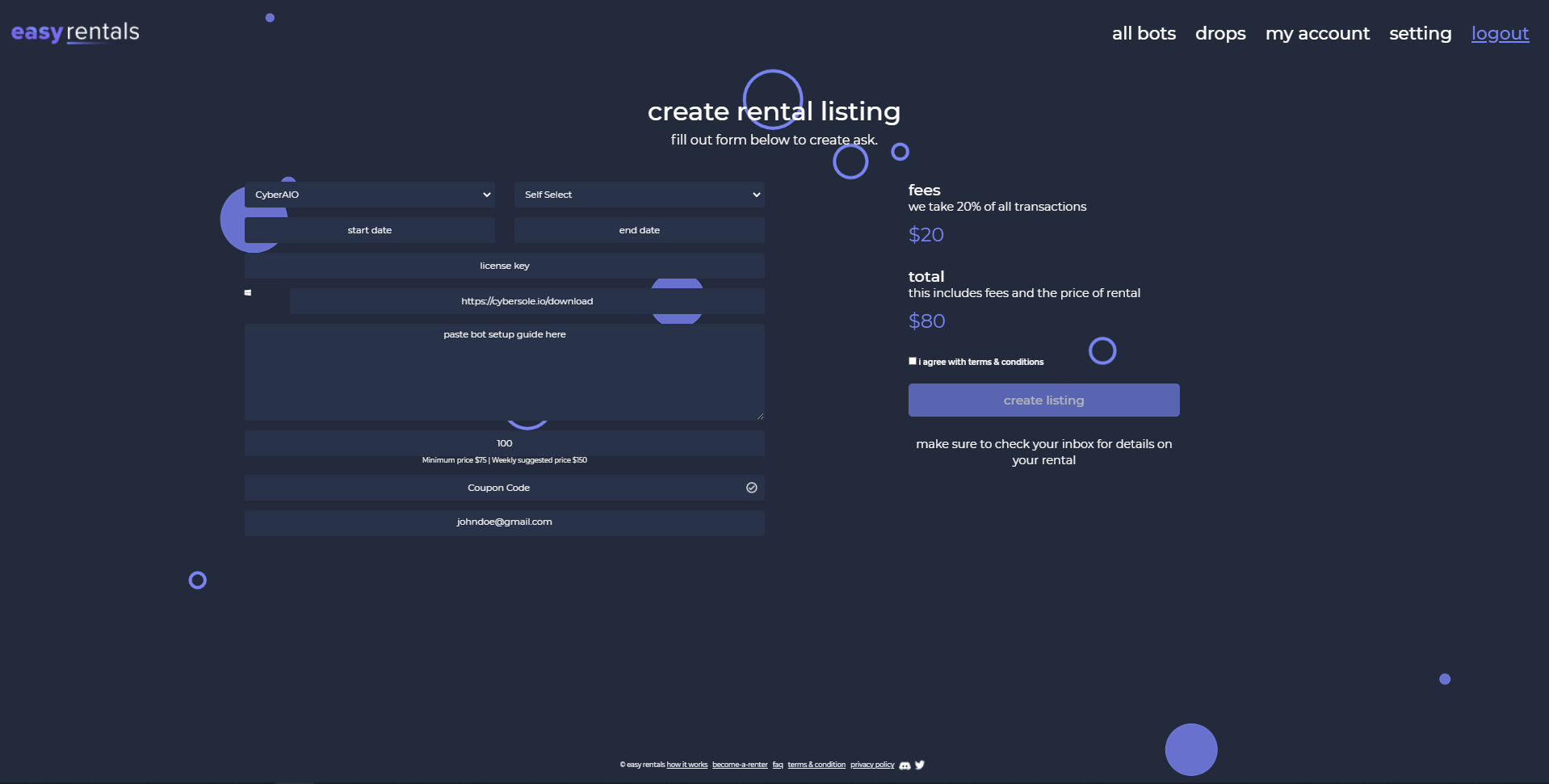On this page you can create rental listings so you can rent out your bots to buyers. You begin by selecting the bot from their dropdown and then you can select the time period in which this renting will last for. After configuring both of those, you have to enter the license key and the download link (if the link is already appearing there then leave it as it is). Below that you can paste the bot setup guide for the buyer to utilize, then based on the bot you are renting out they will calculate a suggested price for you to list it for when you are listing it. On the right side, you will be given a broken down view of the way the price is calculated, whatever price you enter into the price section, Easy Rentals will take 20% as a service fee. It will display your total revenue if a sale is made and then once you're happy with the amount you can create the listing.