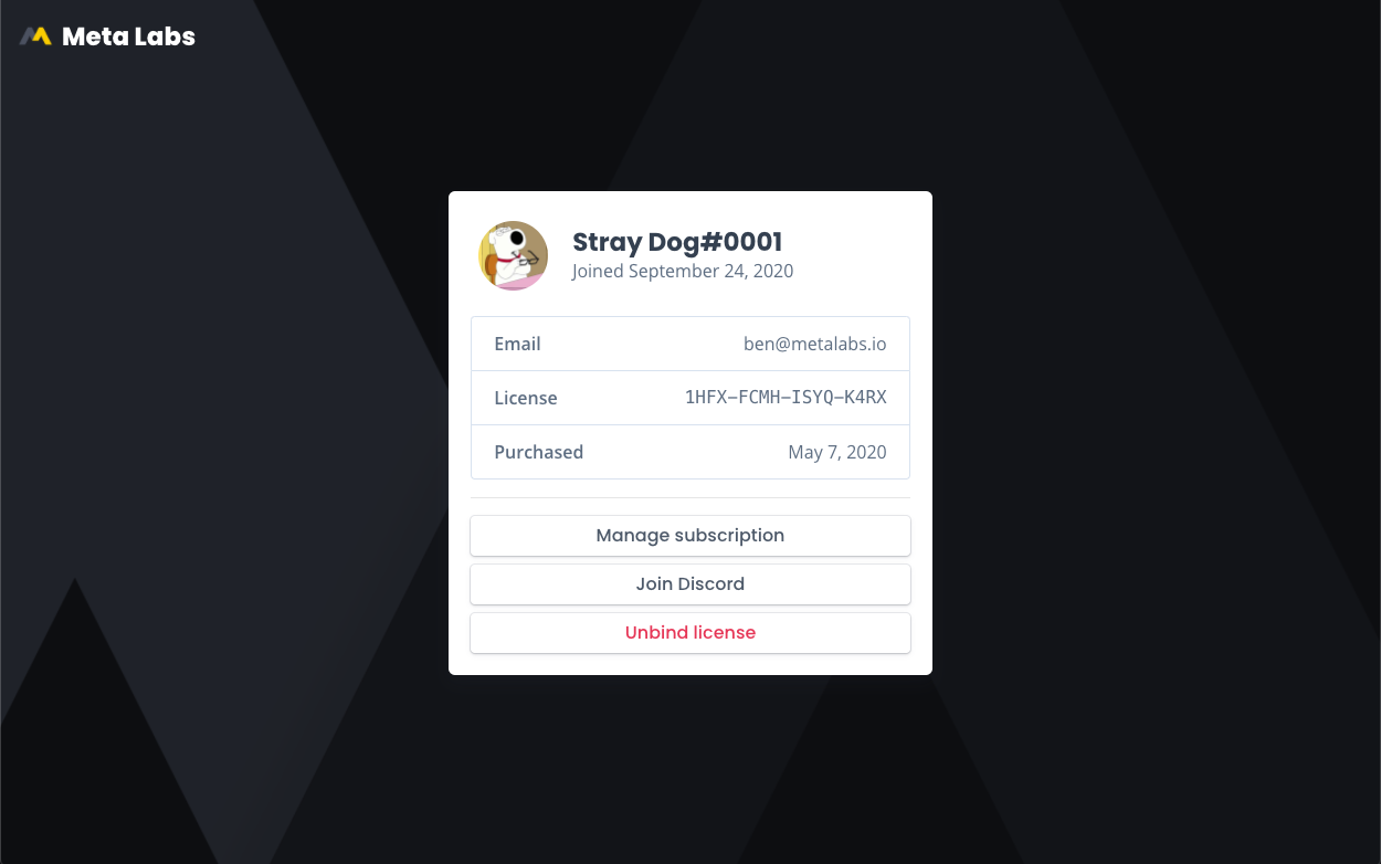 This is the member portal that will be available to all members when they join your group whilst you’re utilizing meta labs. The full discord username is shown as well as the joining date below that. Then the user can view their email, license and the purchased date too. They can click the manage subscription button if they wish to make changes to their subscription, they can click the join discord button to join the groups discord and unbind license to unbind the license from this discord account. It is worth mentioning again that the design of the portal is customizable to some extent. As the owner you can customize the background, logo and colors shown on this page to make the portal unique to your group.