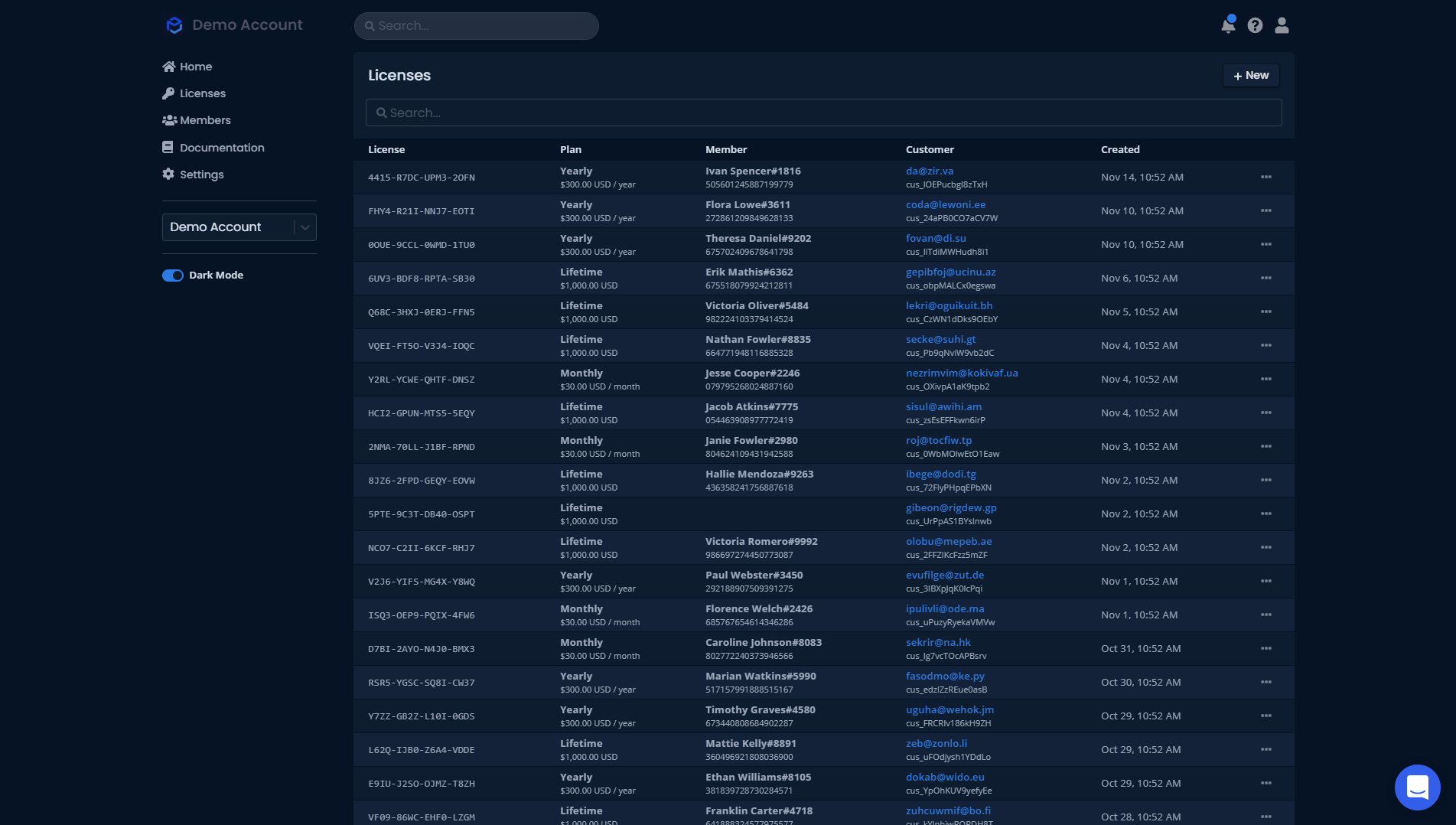 On this page you can view all the licenses in your group and what details are available with them. You will see the license, the plan the member is on, the member with their discord ID below, the customer data and the data it was created. When you click the three dots next to each license you can send an email receipt, you can manage the subscription, clear metadata, unbind their license, revoke license and copy their ID. This allows the group owner to completely manage their members effortlessly from the dashboard.