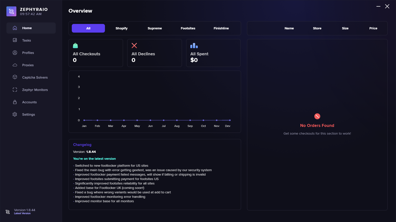 On this page within Zephyr AIO, you can view statistics from all the sites that Zephyr AIO support as well as statistics from the entire bot across all the sites. On each statistic page you can view all the checkouts that have taken place, all the declines as well as the money that has been spent. This is also shown on the diagram below the statistics to visually show you the figures across the date and number axis. On the right side you can view the orders under the following headers, name, store, size & price for the item. Finally, you can view the changelog per each update on the bottom of the page.