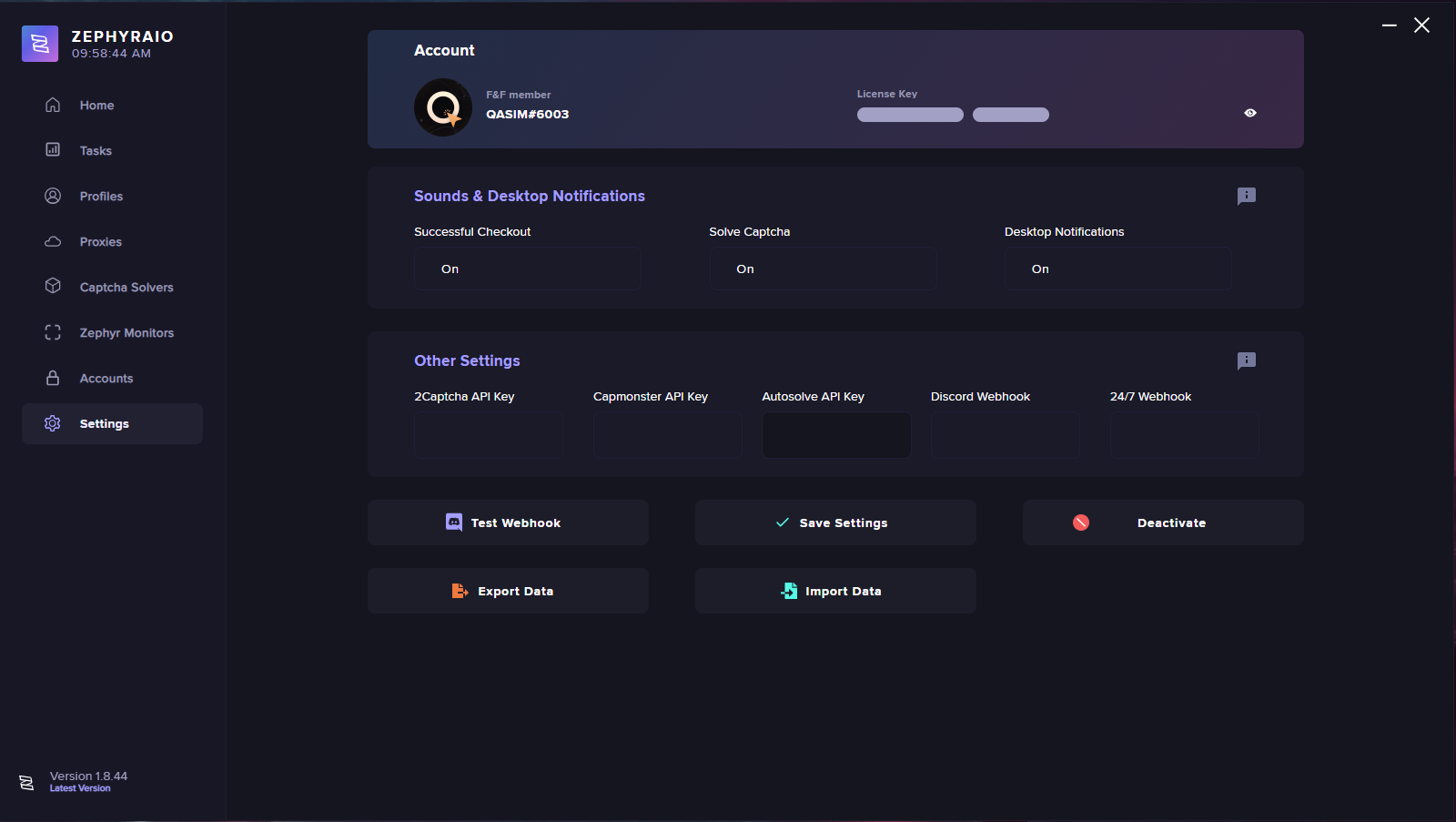 On this window within Zephyr AIO, you can configure the settings for the application. At the top of the page you can view the account section which shows the Discord account that is binded to your license key and you can also view the key by clicking the eye button. Below that section you can configure the sounds & desktop notifications, below that there is the other settings section which contain your webhook fields as well as the captcha key fields. Finally, at the bottom of the page you can test the webhook, save the settings, you can deactivate your key, you can export data and import data.