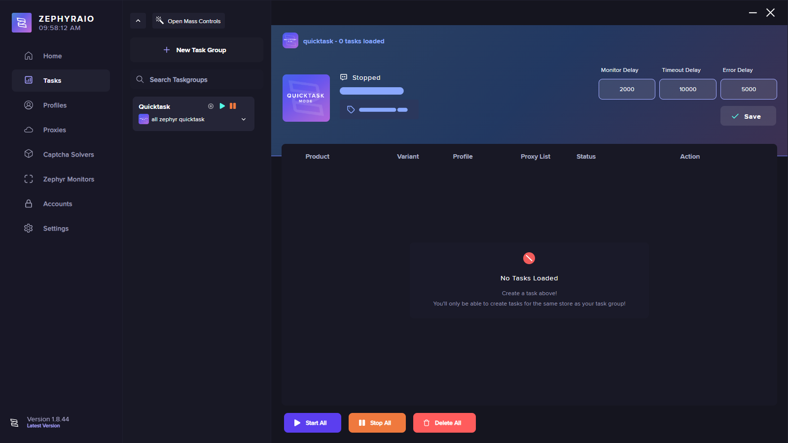 On this page within Zephyr AIO, you can view the task groups as well as the tasks within it. You can create a task group on the left side of the page, once you create a task group it will be shown in the list, you can navigate between multiple task groups by clicking on them. Once you click on the group it will show you the view above, you will see the tasks under the following headers, product, variant, profile, proxy list, status and actions. You can configure the monitor, timeout and error delay, finally, you can utilize the collective action buttons on the bottom of the page too.