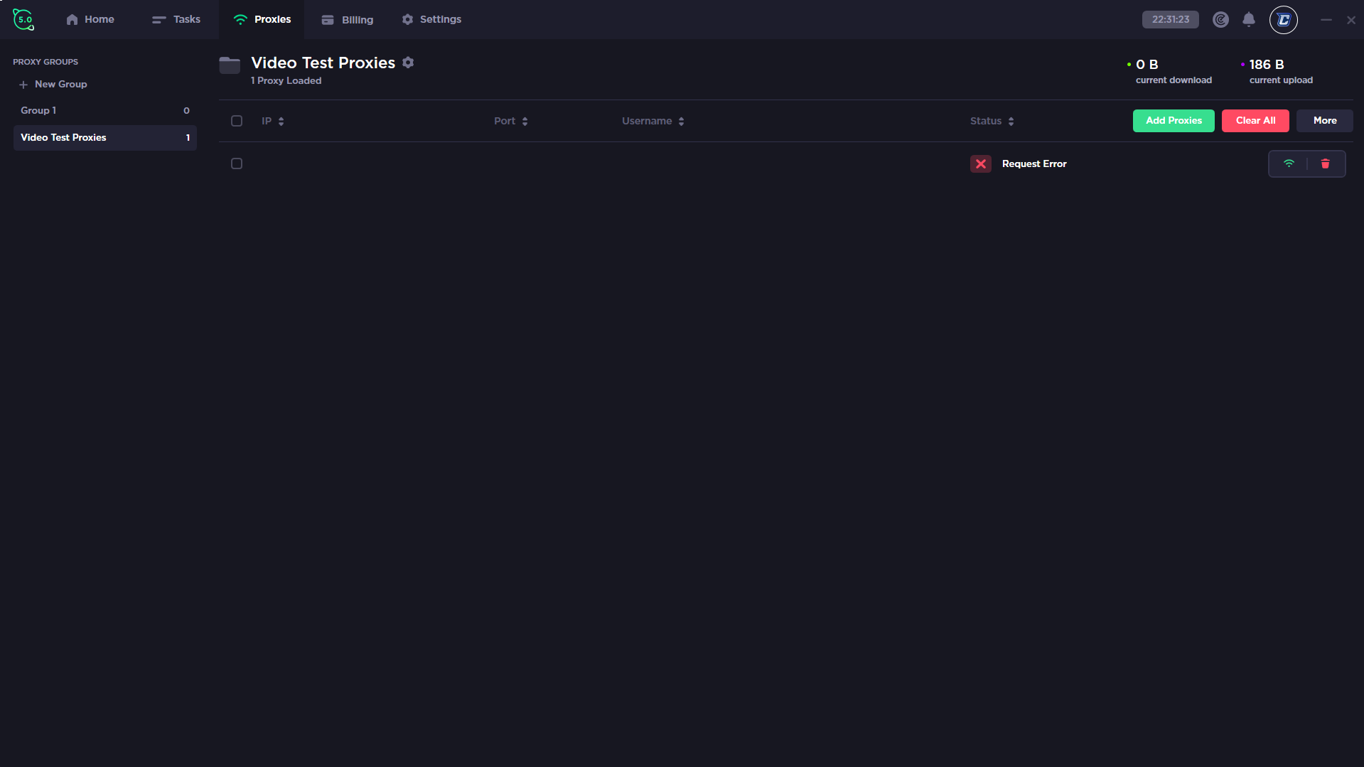On this page within CyberAIO, you can view the inside of a proxy group. You can view all the created proxy groups on the left side but also create a proxy group on the left side. Once you're inside of a proxy group you can view the proxies within the group in the formation IP, port, username and the status of the proxy as well as the actions for that proxy. You can add proxies and clear proxies using the buttons at the top, you can configure the proxy group settings at the top of the page. A new addition of CyberAIO 5.0 is that you can view statistics regarding the data being used by the proxies such as the current download and upload.