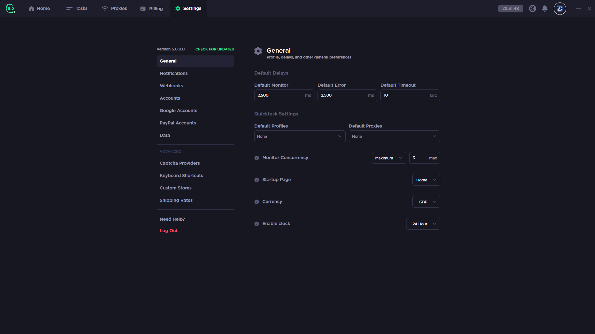 On this window within CyberAIO, you can configure the settings for a ton of things within the bot. There is quite a few tabs that have settings in which you can configure to your liking. The tabs are as follows, general, notifications, webhooks, accounts, google accounts, paypal accounts, data, captcha providers, keyboard shortcuts, custom stores and shipping rates. Finally, you can logout and click the need help button at the bottom too.