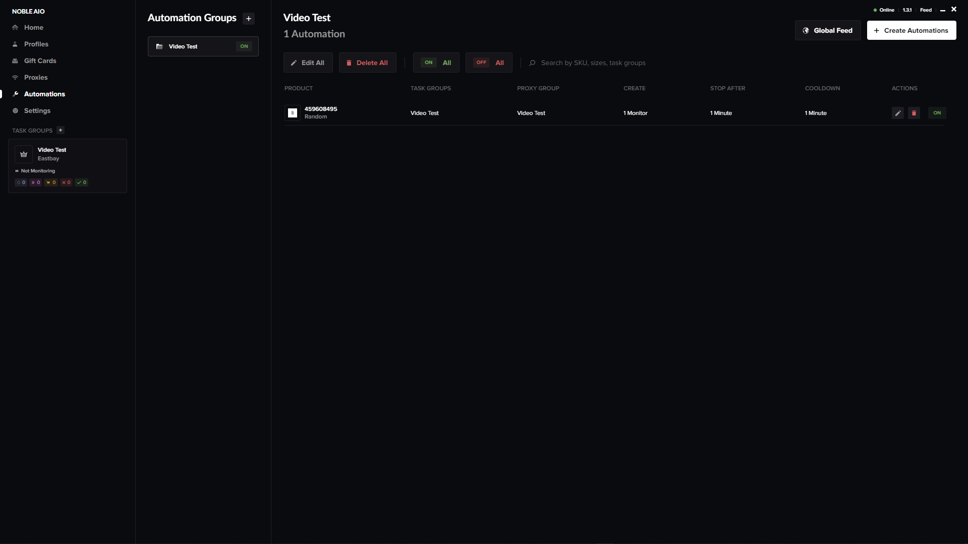 On this window within Noble AIO, you can view the created Automations groups and within those groups you can view the created automations. The idea of Automations within Noble AIO is whenever a product restocks that matches a SKU in your SKU list, automation will automatically start any existing monitors in all of your task groups. Going back to the page itself, the details that will be shown on your created automations are the product, tasks groups being used, proxy group being used, how many monitors will be created, how long it will stop after, the cooldown time and the actions available for the automation. You can use the collective action buttons at the top of the page, you can view the global feed and create automations using the “Create Automations” button.