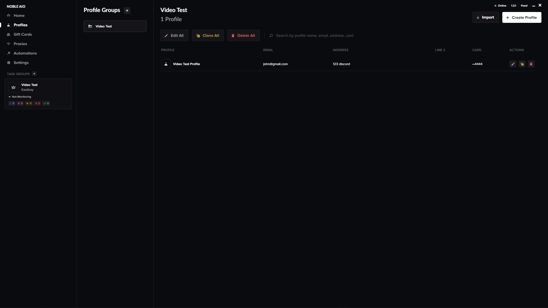 On this page within Noble AIO, you can view the inside of a profile group that can be created within the bot. Inside the group you can view the created profiles with a variety of details shown on each individual profile. The details are the profile name, the email being used, the address being used, the second line of the address, the last 4 digits of the card number being used and the actions available for the profile. You can use the collective actions buttons at the top of the page and you can also search through the profiles using the search bar. You can create profiles using the “Create Profile” button and you can import profiles using the import button. Finally, the profile group name can be viewed at the top with the total number of profiles within group being displayed under the name.