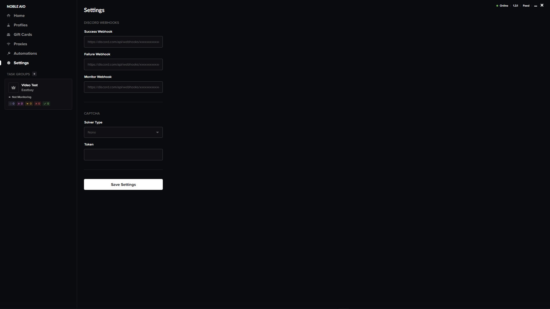 On this window within Noble AIO, you can view the settings within the bot that can be configured. You can configure the Discord Webhooks section which consists of the success, failure and monitor webhook fields. You can also configure the captcha for the bot by selecting the solver type and token on this page, once you're done you can save your settings using the “Save Settings” button.