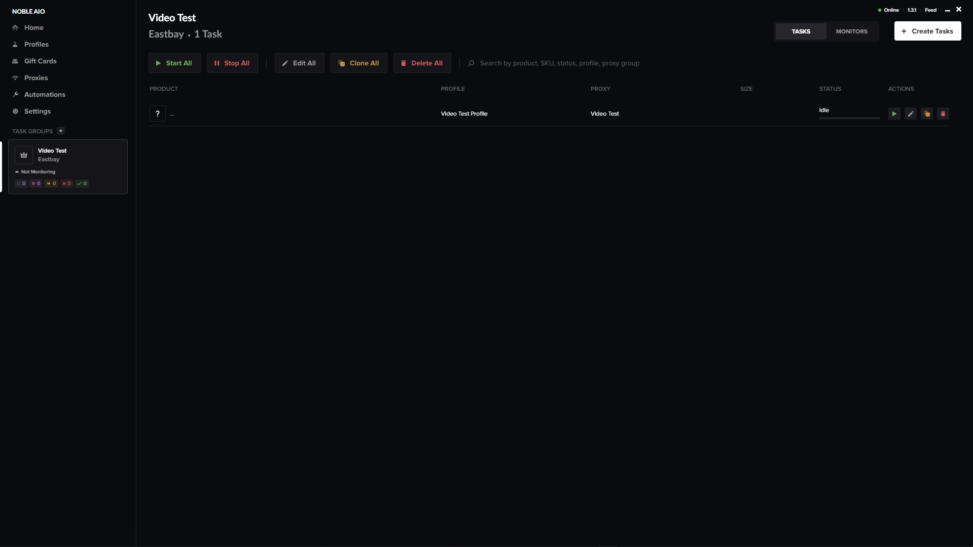 On this page within Noble AIO, you can view the inside of a task group that you can create within the bot. Inside the group you can view the created tasks with a variety of details shown on the task itself. These details are the product, the profile being used, the proxy, the size, the status and the actions available for the task. On this page you can view the collective action button on the top of the page and you can also search through your created tasks too. You can create the tasks using the “Create Tasks” button and you can also create monitors tasks by clicking onto the other page.