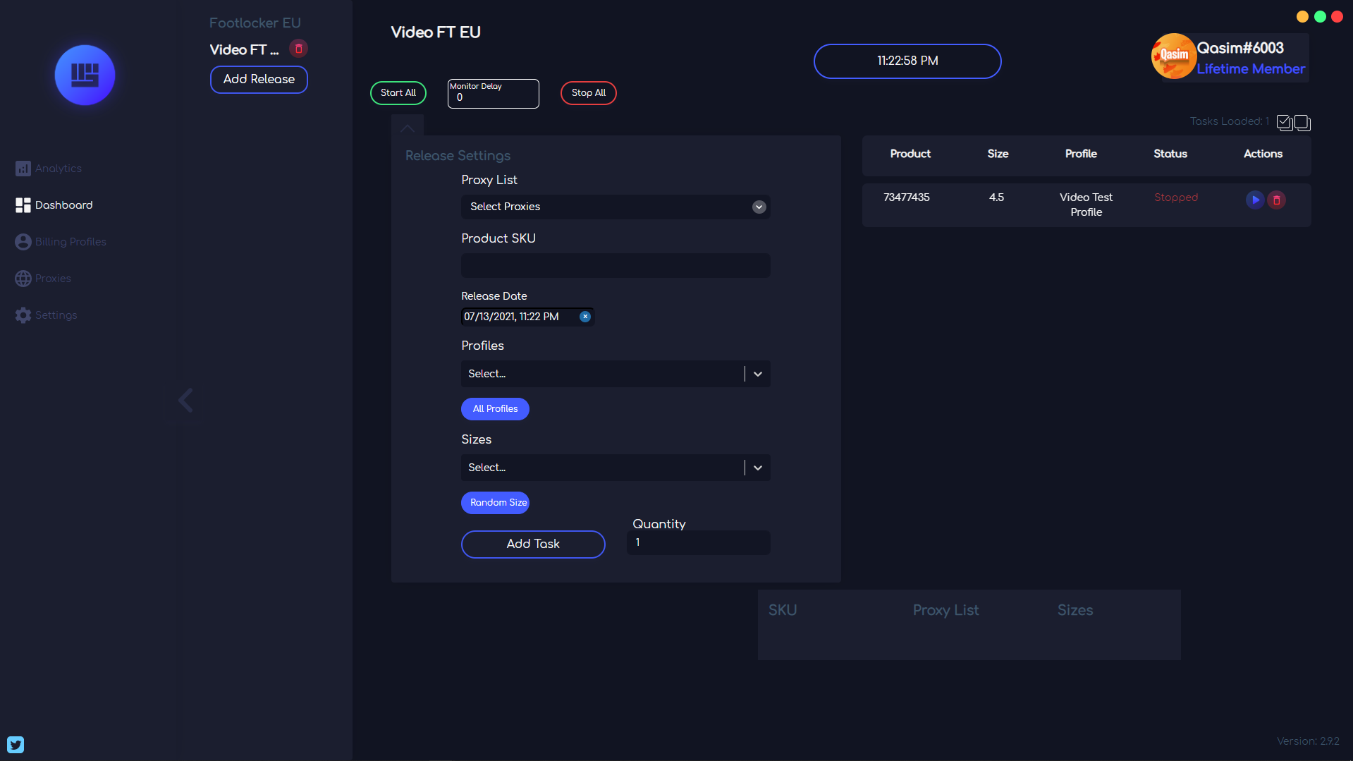 On this window within Obey AIO, you can view the analytics within the bot based on your activity within the bot. You can view how many tasks are loaded, the successful tasks, the failed tasks, the total money spent and finally, the checkout feed below.