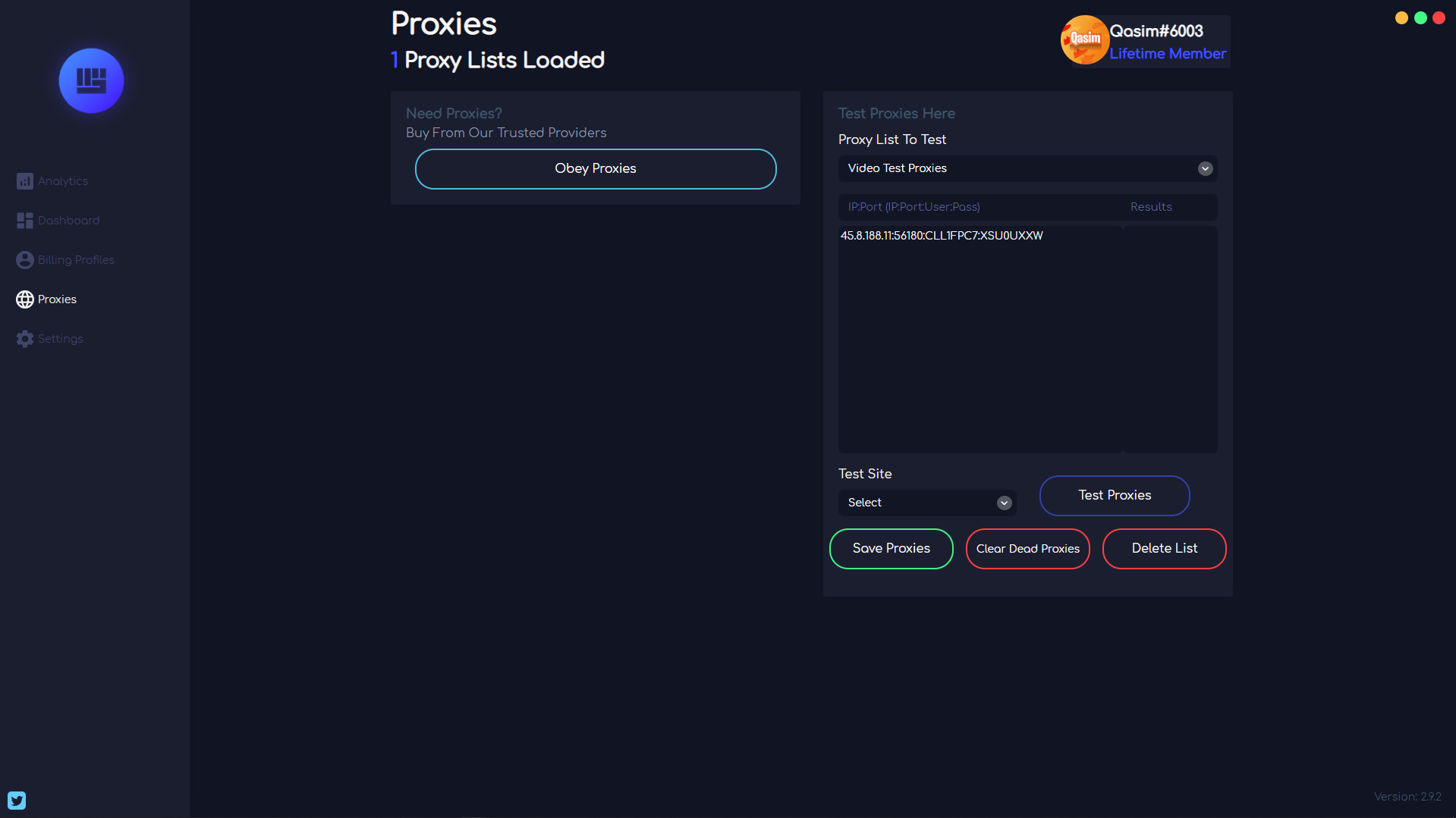 On this window within Obey AIO, you can create proxy lists and add proxies to those lists so they can be used with your tasks. You can also test the proxies on the test sites to ensure your proxies are working correctly, if any are not working correctly, you can utilize the “clear dead proxies” button to remove the dead proxies from the list. Finally, you can purchase proxies if you are in need of some.