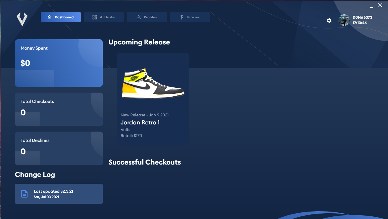 On this window within Viper, you can view the dashboard part of the bot. You can view the money you have spent within the bot, the total checkouts, the total declines and the upcoming releases. You can also view the changelog for the updates pushed to the bot as well as the successful checkouts in a list form.