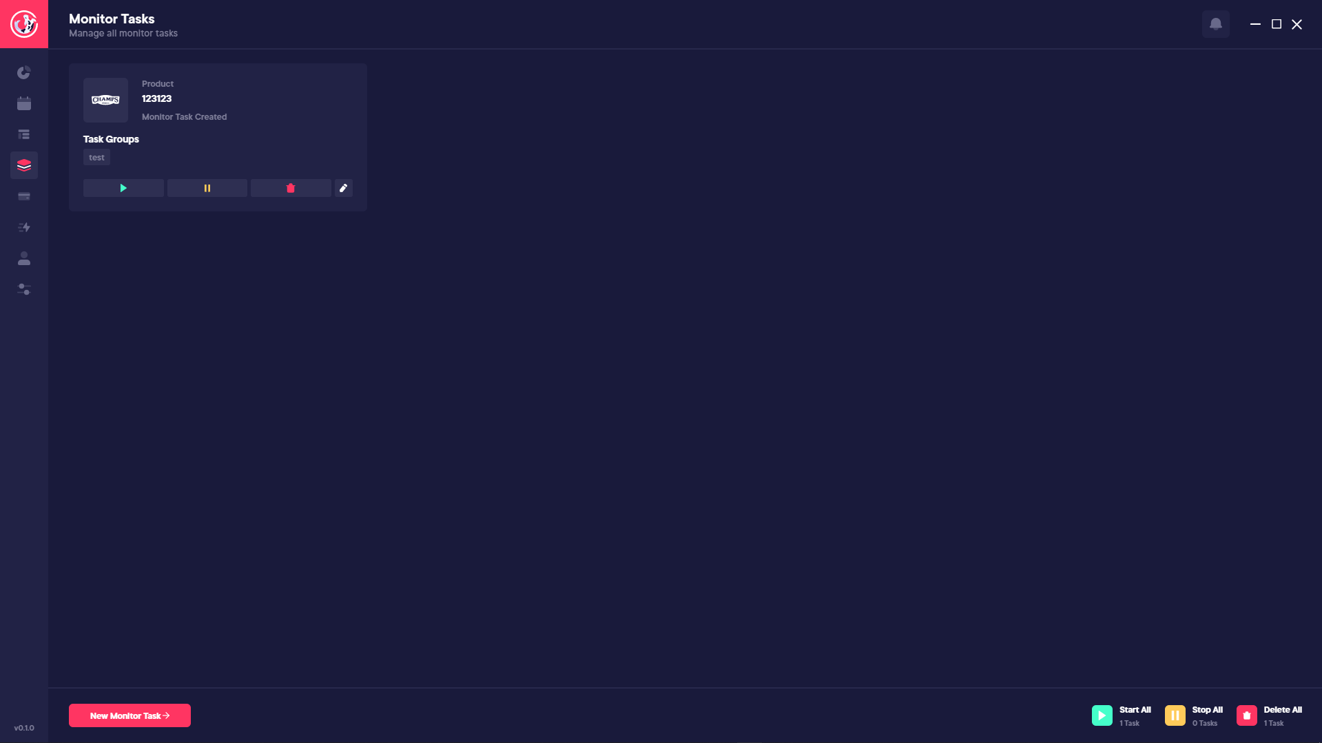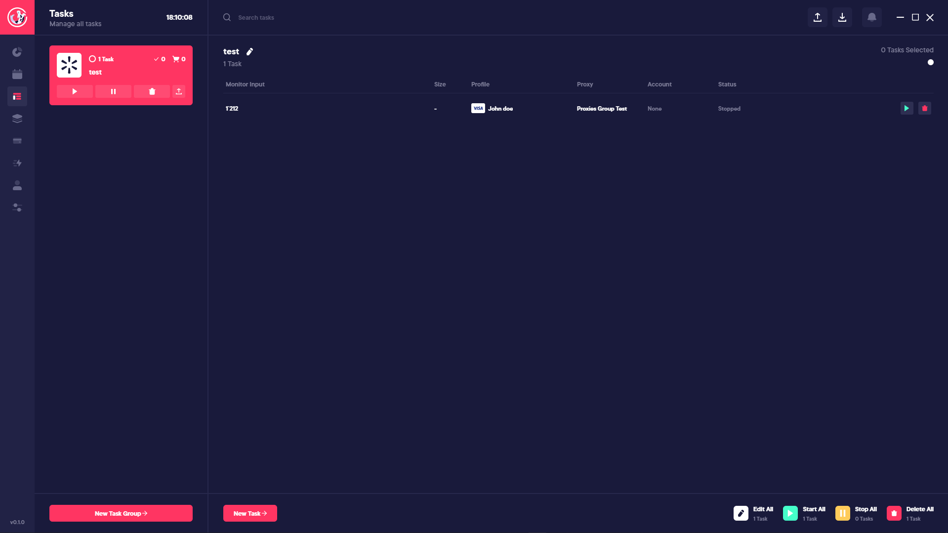 On this window within Koi AIO, you can create task groups and then create tasks within that group. This will allow you to segregate your tasks by the site you're choosing to bot which allows you to manage the tasks accordingly. On the tasks page you have collective action buttons such as starting the tasks, ending the tasks, editing the tasks and deleting the tasks. You can also search through your created tasks too.