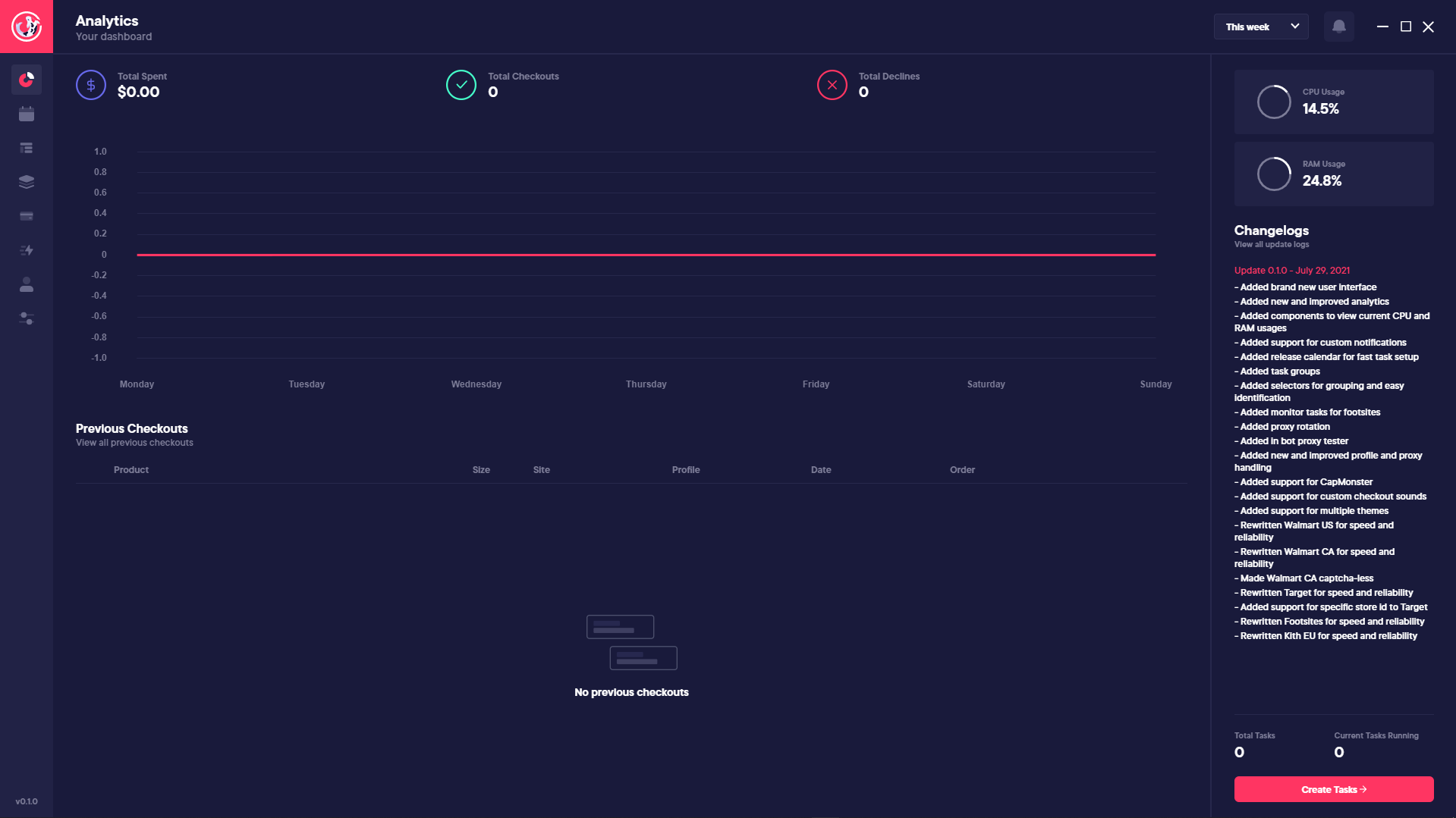 On this window within Koi AIO, you can view the analytics within the bot which displays a lot of useful information for the user. At the top you can view the total amount spent, the total checkouts and the total declines based on your time using the bot. You can view this information a graph below the statistics at he top and on the right side you can view your CPU usage as well as your RAM usage. Below that section, you can view the changelogs for the bot per each update, then below that section you can view the total tasks within the bot, the total running tasks, and the create task button. Finally, you can view the previous checkouts on this page too.