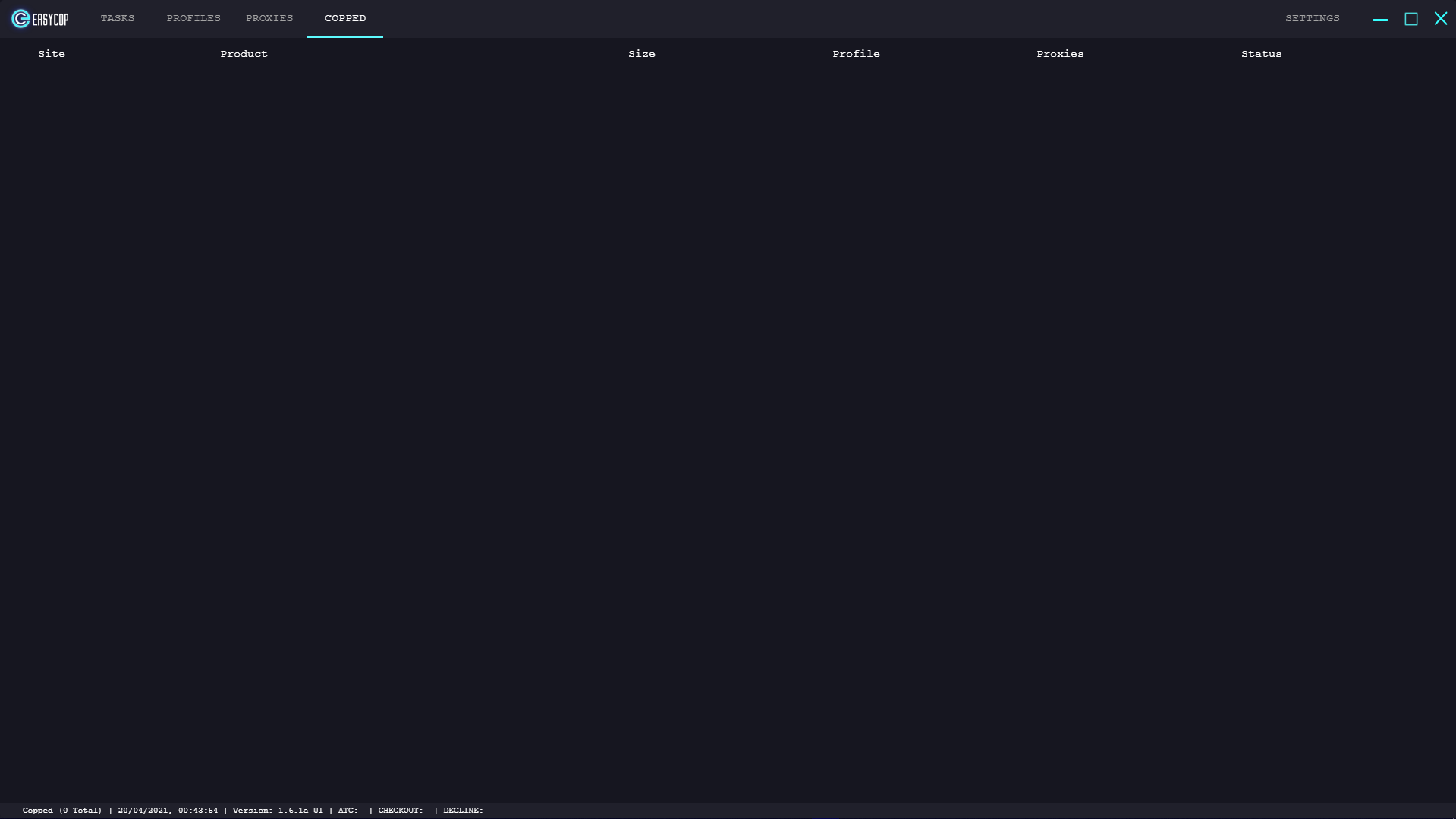 On this window within EasyCopBots, you can view the successful checkouts on this page with a variety of headers. The headers are “Site”, “Product”, “Size”, “Profile”, “Proxies” and “Status”. This can be useful to track how successful you were on a release after you stop your tasks or even mid drop.