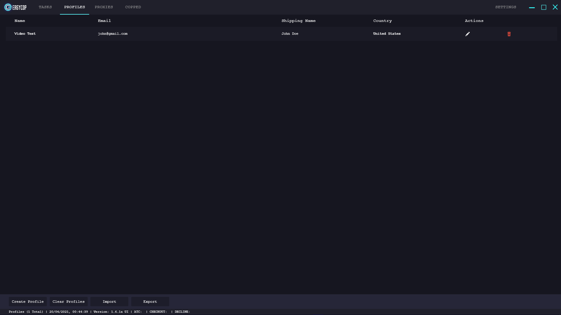 On this window within EasyCopBots you can view the created profiles as well as create profiles for you to use in your tasks. You can configure your profiles name so you can distinguish them between each other and a variety of details from the task will appear under a few headers. You do also have the option to import and export the profiles if you wish.