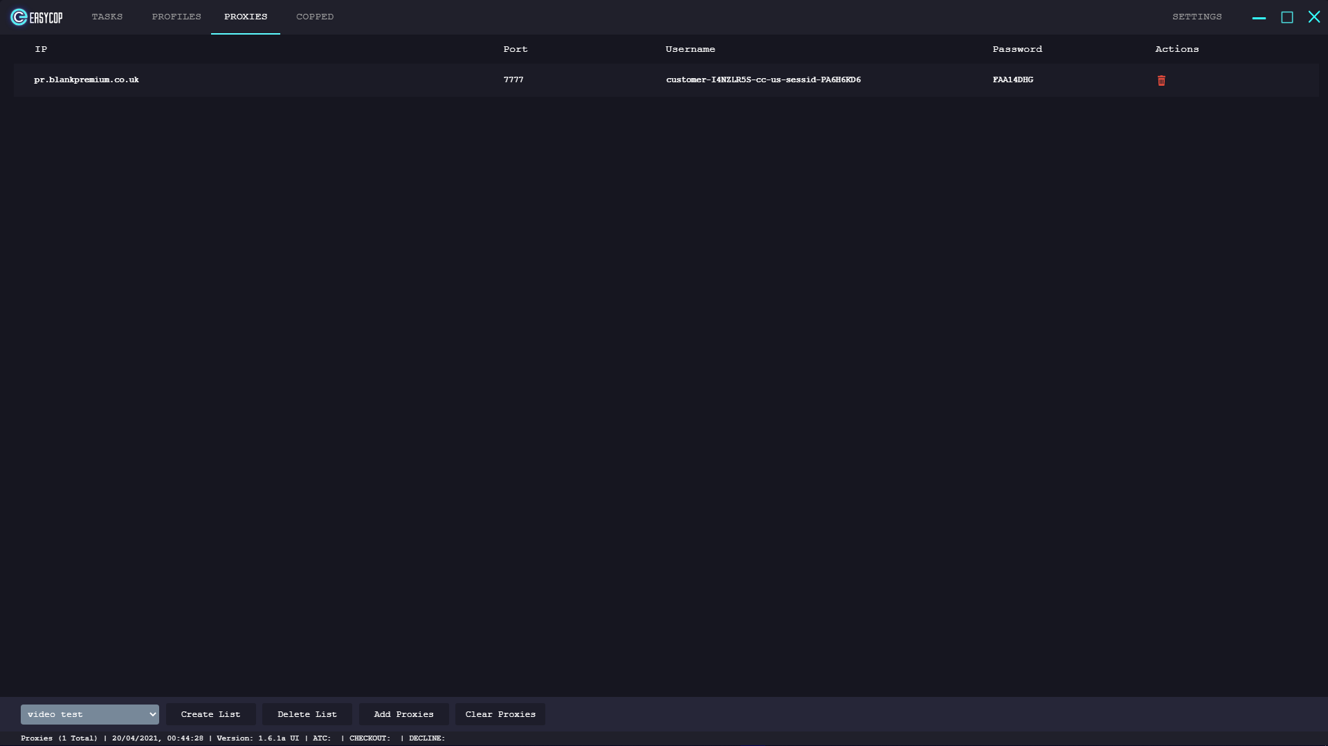 On this window within EasyCopBots, you can view the proxies you enter that can be used with your tasks. You can create a proxy list at the bottom left then inject proxies into the created list, the list is then available to select during the task creation process. Your proxies will appear under a few headers on screen when you select the list.