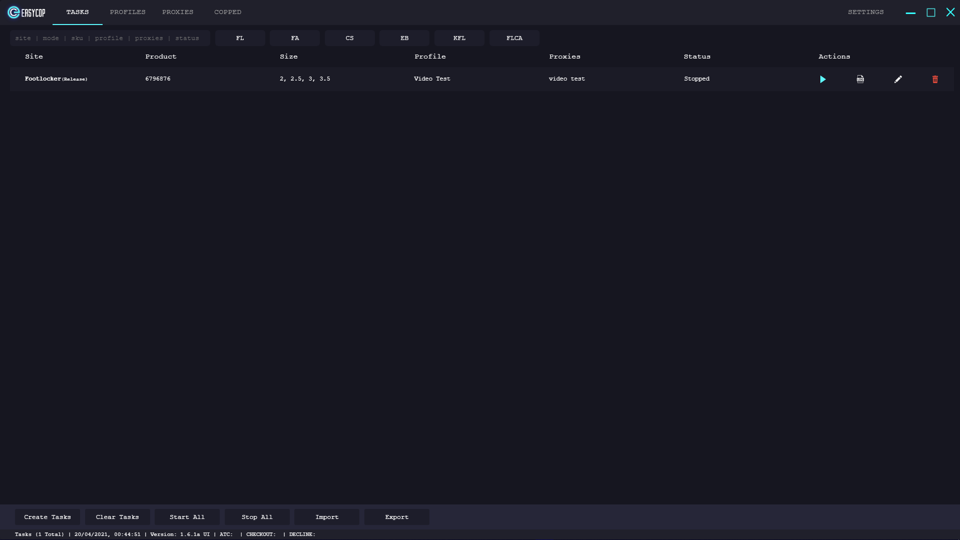 On this window within EasyCopbots, you can view the tasks you have created within the bot here and you can also create tasks on this page. You can filter the created tasks through their supported sites at the top of the page. You can also import & export tasks if you wish on this page as well as use the collective actions buttons for your tasks. Once you create your tasks, you can view the created tasks under a few headers with their actions. Finally, you can clear your tasks with the bottom of the window.