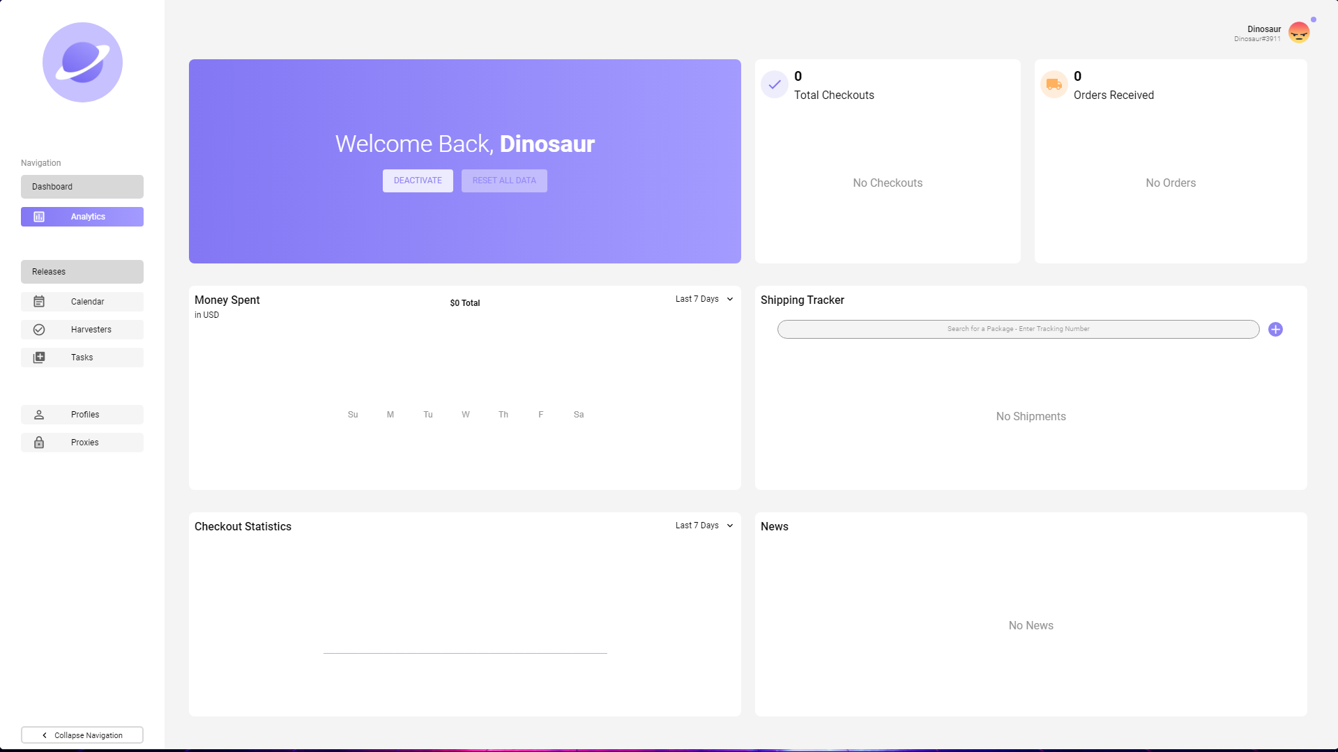 On this window within Nebula, you can view a variety of analytics within the bot based on your activity. Firstly, you can view your total checkouts as well as total orders received on the right side of the bot, below that you can utilize the shipping tracker and view the news tab within the bot. On the left side, you can view the money you have spent across a few time periods and the checkout statistics across the same time periods. Finally, you can deactivate your instance if you wish.
