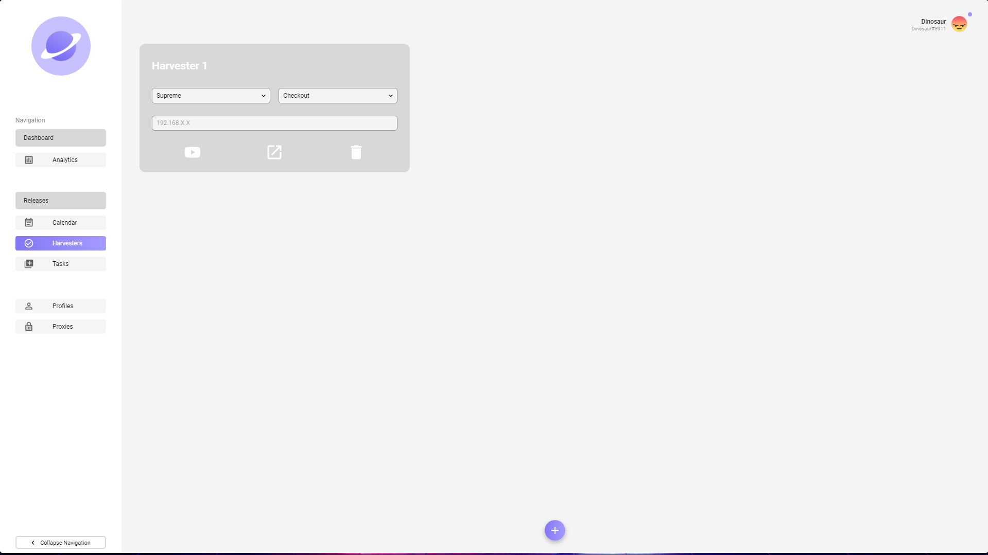 On this window within Nebula, you can create and launch harvesters on this page that will be used with your tasks. On each harvester, you can click the YouTube icon to launch YouTube, the launch button to launch the harvester and the delete button to delete the harvester.