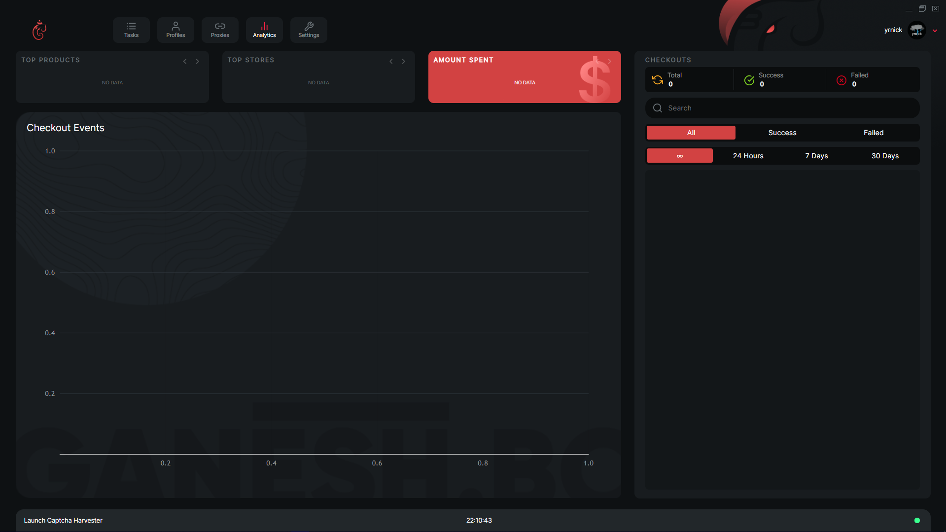 On this window within Ganesh, you can view some analytics that is related to the performance of the user within the bot. At the top, there is a number of boxes all with different data within it, the first being top products, then top stores as well as amount spent. Below that, you can view the checkout events that took place within the bot. Finally, on the right side you can view the checkouts and filter it with the filters available.