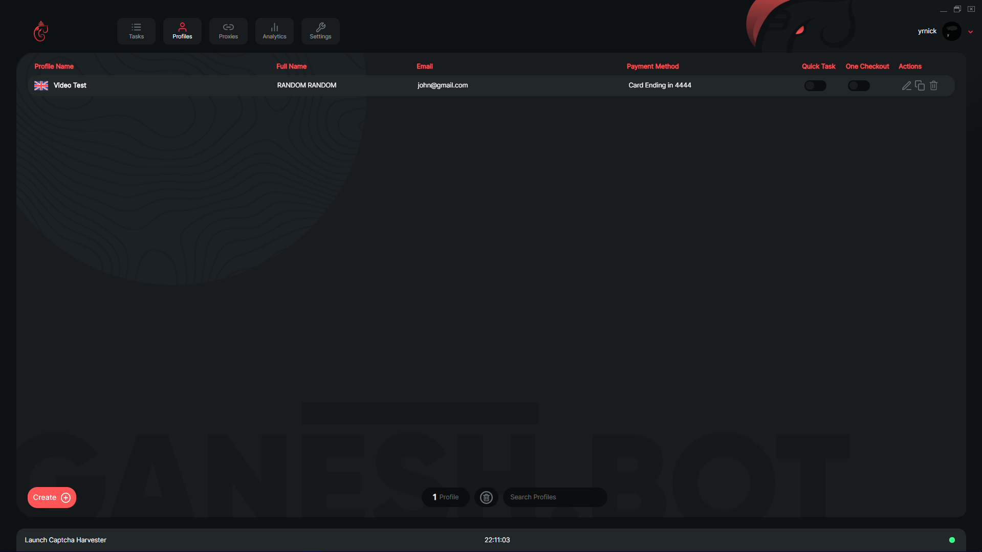 On this window you can view and create profiles within Ganesh. You can create profiles using the create button in the bottom left as well as delete all the asks using the delete button in the middle of the page. Once you have created a task it will appear on this page with some of the details being displayed under a variety of headers.