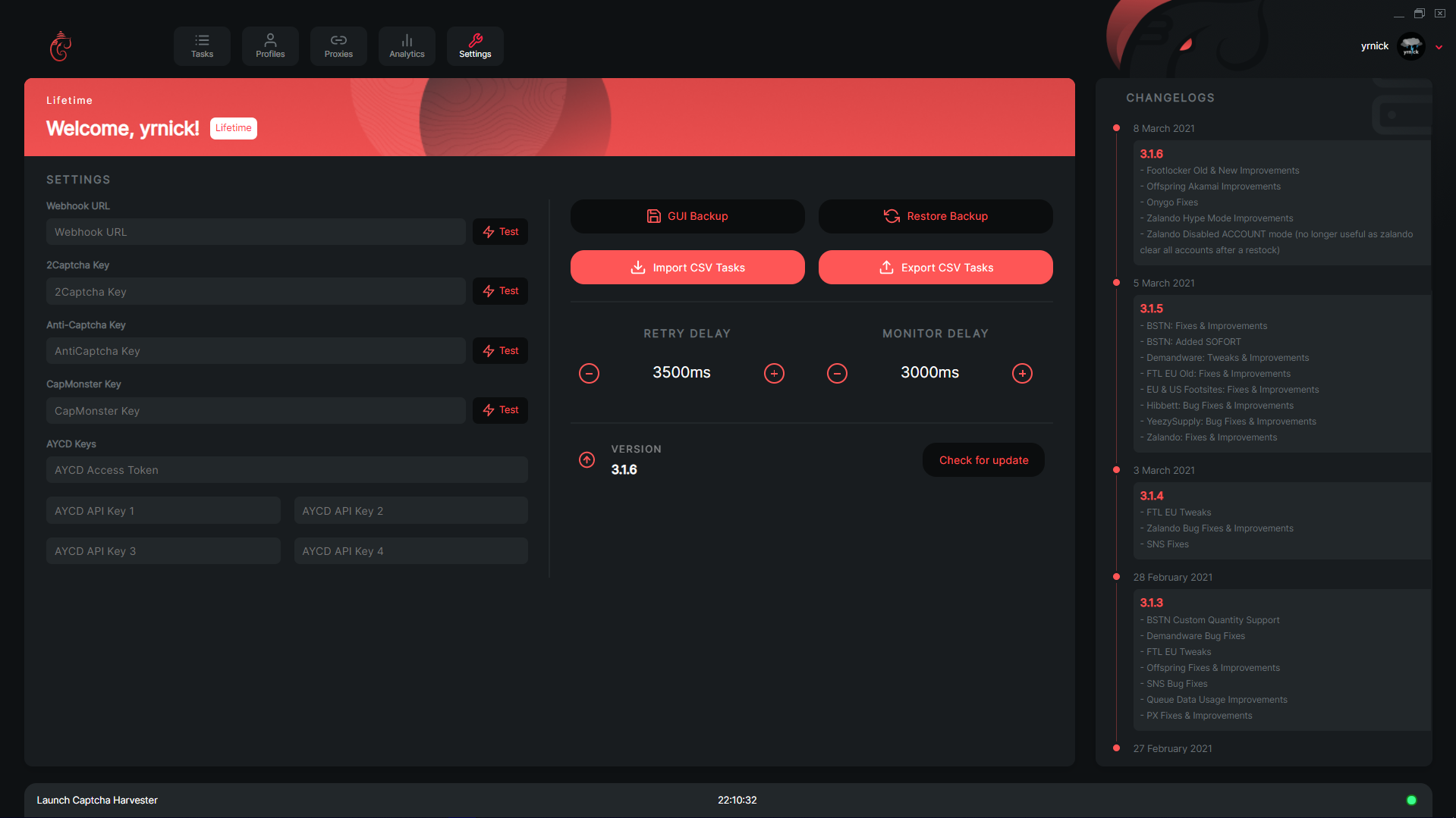 On this window within Ganesh, you can configure your settings for the bot as well as view some information about the bot too. On the left side, you can configure your webhooks as well as your captcha harvesting keys for the bot. In the middle, you can configure the delays and import as well as export your tasks. Below that part, you can check for updates within the bot and finally, on the right side you can view the changelog of the bots updates.
