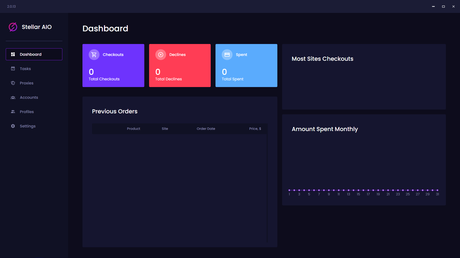 On this window within StellarAIO, you can view the dashboard page. On this page you can view the total checkouts, declines and the total amount spent. Below that you can view your previous orders and then on the right side you can view the most site checkouts as well as the amount spent monthly illustrated on a diagram.