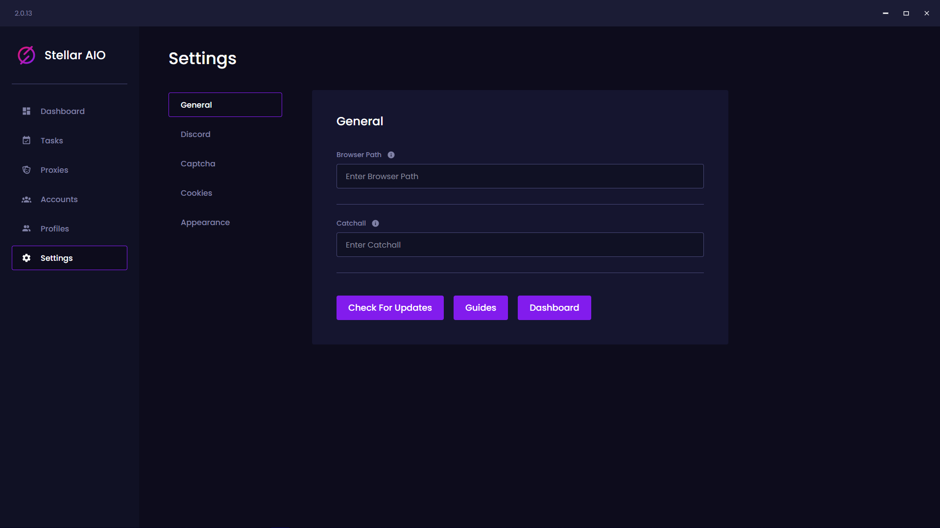 On this window within StellarAIO, you can customize the settings tab within the bot. The tabs are the general settings tab, the discord tab, the captcha tab, the cookies tab and the appearance tab. Each of them have names that dictate what those settings will entail based off their name.