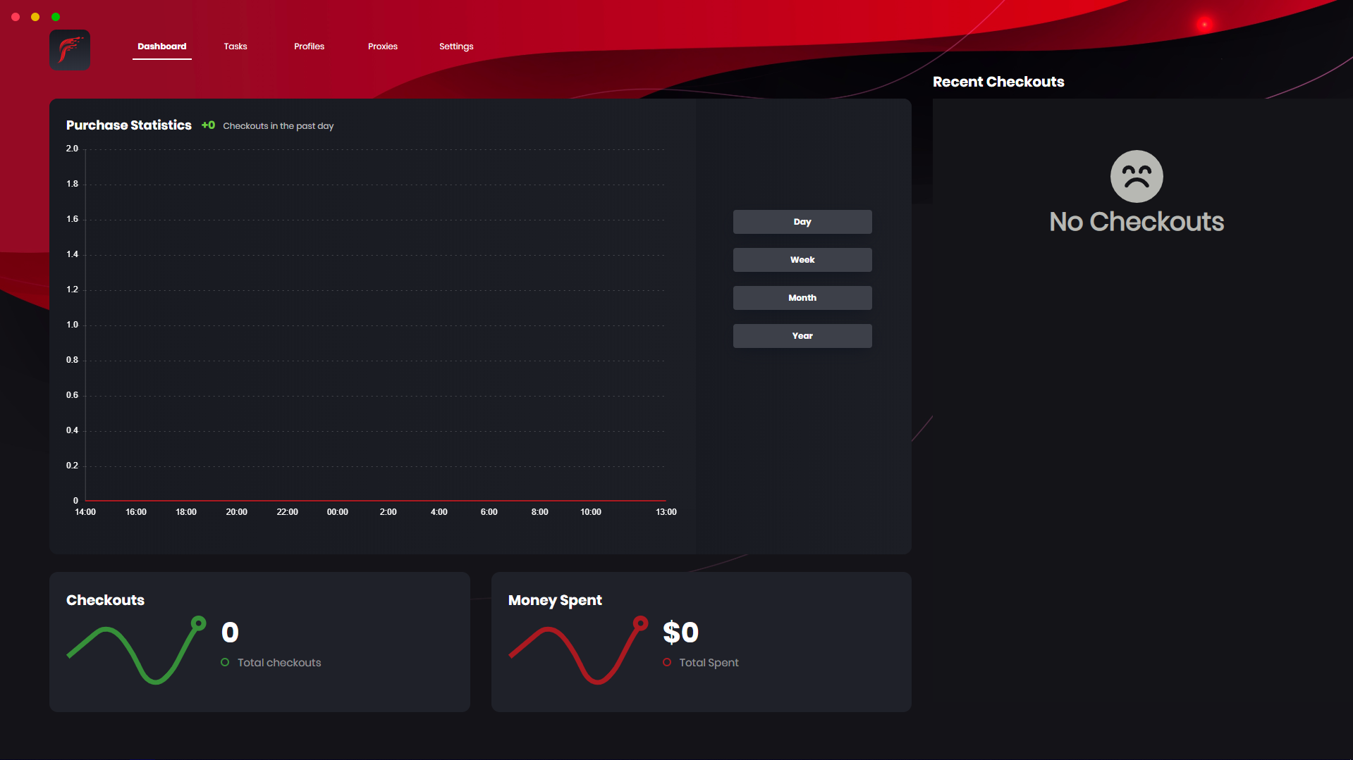 On this window within Fluid, you can view the purchase statistics based on the checkouts that take place within the bot, that is then illustrated on a diagram against a few time periods. Then below that graph, you can view the total checkouts and the money spent within the bot, finally, you can view the recent checkouts on the far right side.