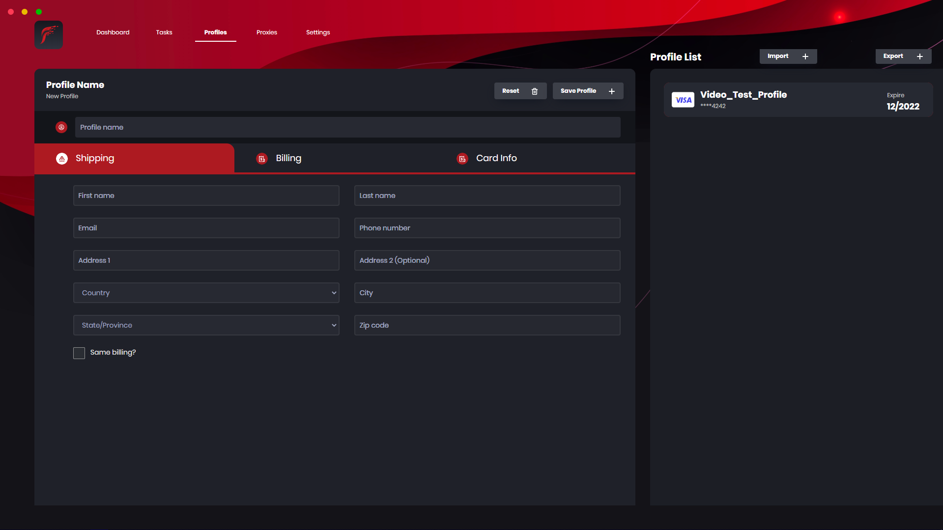 On this window within Fluid, you can view the created profiles & also create a profile for the bot to use. You have three sections when creating the profile, shipping, billing and card information. You can also uniquely name the profile and the profile will appear on the right side. Finally, you can import or export profiles too.