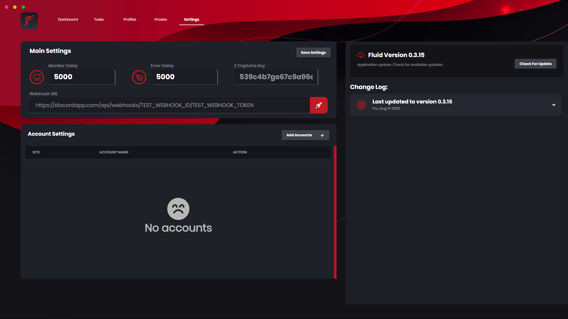 On this window within Fluid, you can configure the settings within the bot. The main settings tab is where you configure the monitor & error delay. You can also configure the 2captcha key as well as the webhook URL. Below that, you can accounts to the bot that can be used with your tasks and finally, you can check for updates as well as view the change log on the right side.