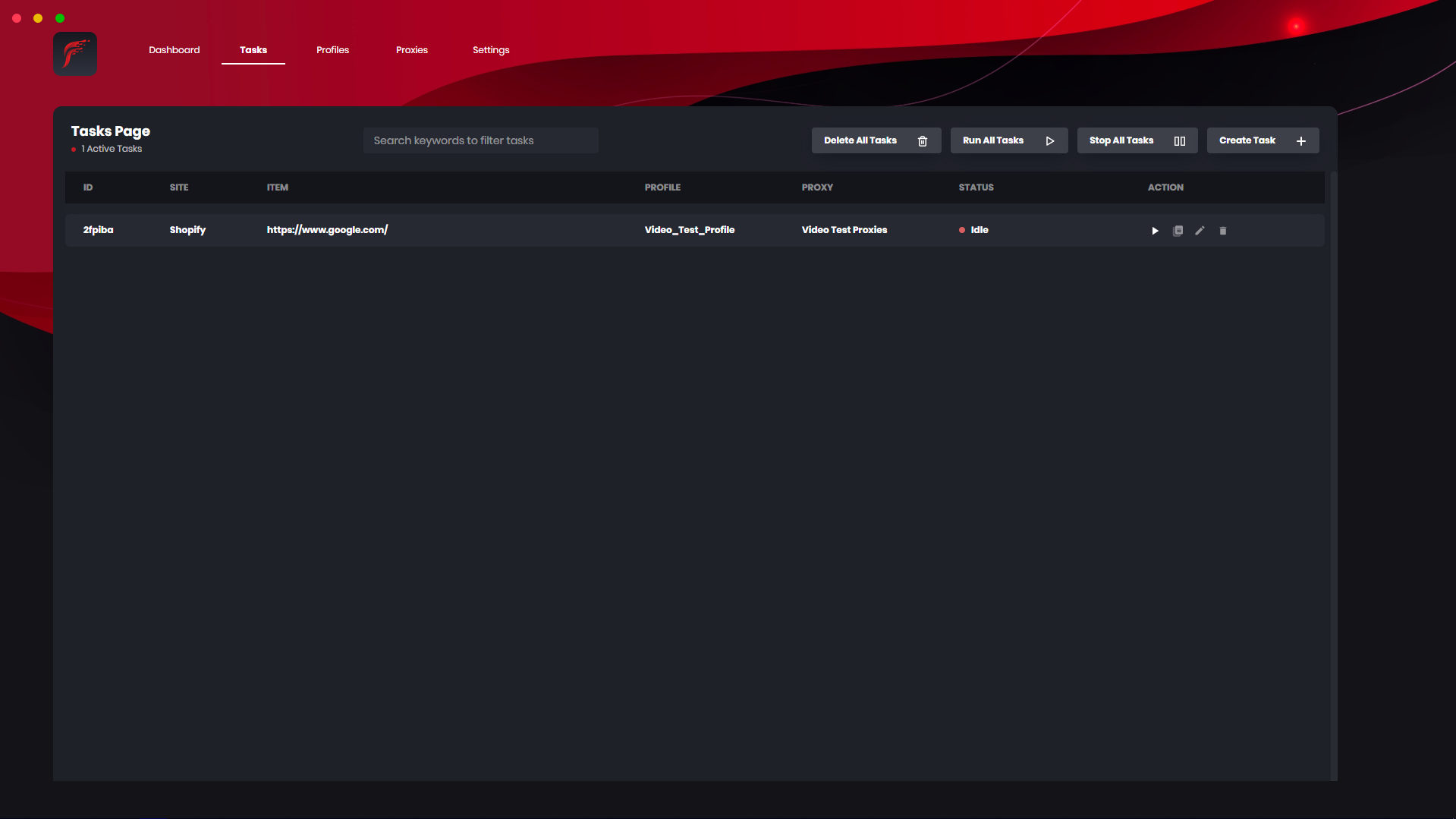 On this window within Fluid, you can view the tasks that you have created and there is a variety of headers that are within the tasks page too such as item, ID, site, proxy and a few others. You can filter keywords through the bot, delete all tasks, run all tasks, stop all tasks and create a singular task.