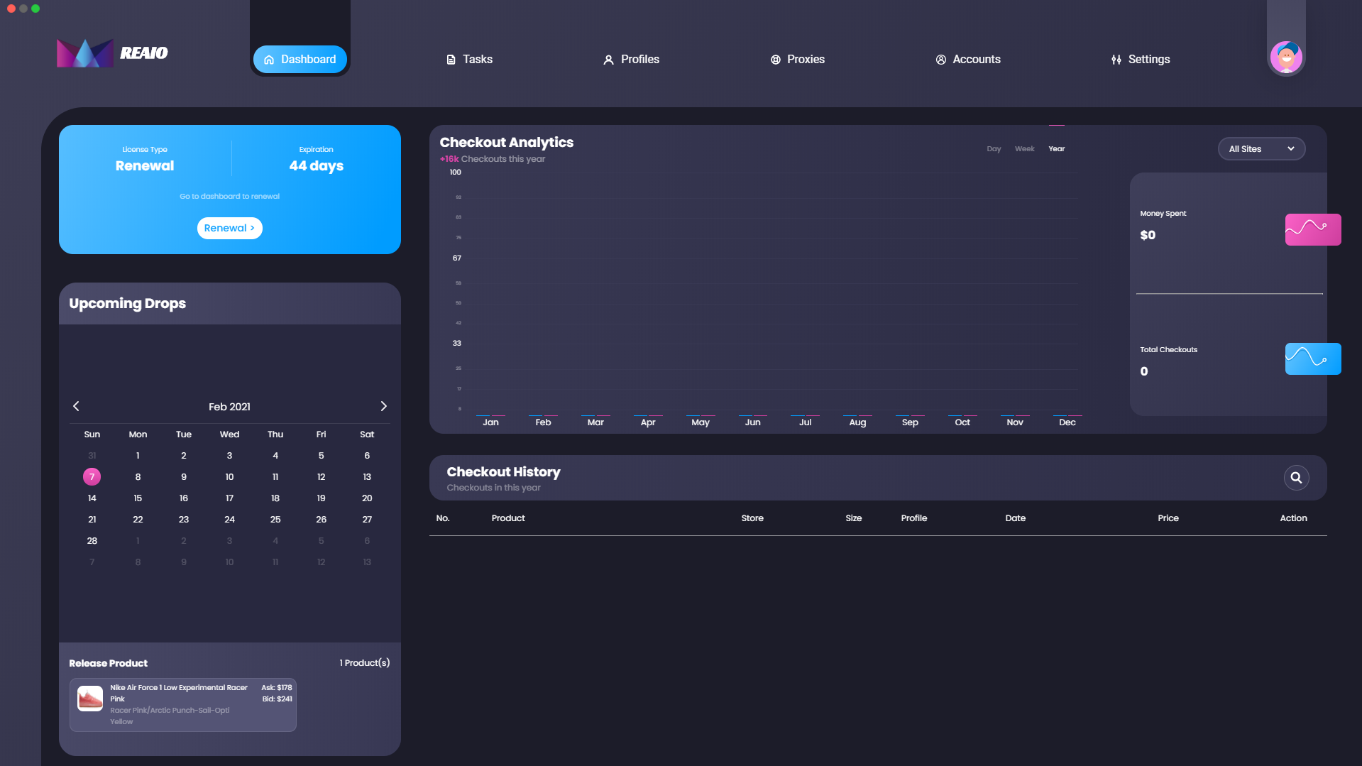 On this window within REAIO, you can view some analytics within the bot such as the checkout history and the money spent within the bot. You can filter it between the site you'd like to collect data for or the time period as well. Below that you can view the checkout history within the bot and you can also view the upcoming drops on a calendar, this is pretty useful when looking for releases to go for. Finally, you can view some information regarding your license as well.