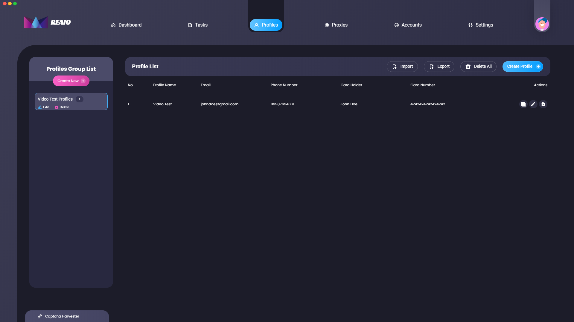 On this window within REAIO, you can create profiles that be used within the bot. All these profiles can be placed into a profile group, you can create a group on the left side and you can create a profile on the right side.