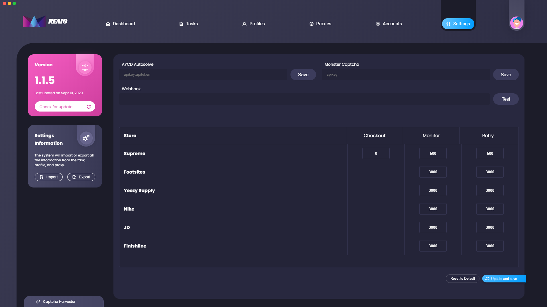 On this window within REAIO, you can view the settings page in relation to the bot. You can view the version number of the application and import as well as export settings if you wish. You can also configure the delays for the individual sites that is supported by the bot as well.