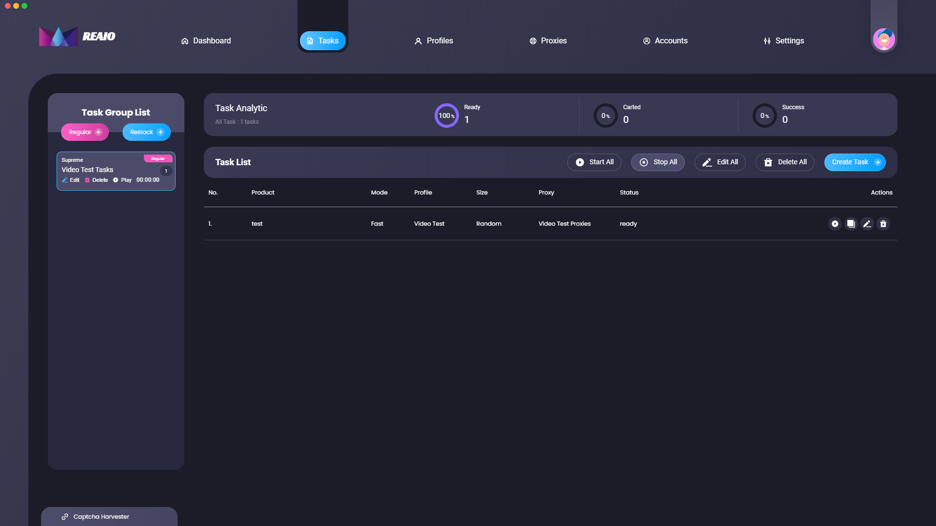 On this window within REAIO, you can view the tasks that you have created within the bot. All the tasks are separated by task groups and that is separated by the sites that the bot supports. At the top of the page, you can view the task analytics at the top too which show successful, ready and carted tasks. Finally, you have some collective buttons on the page too.