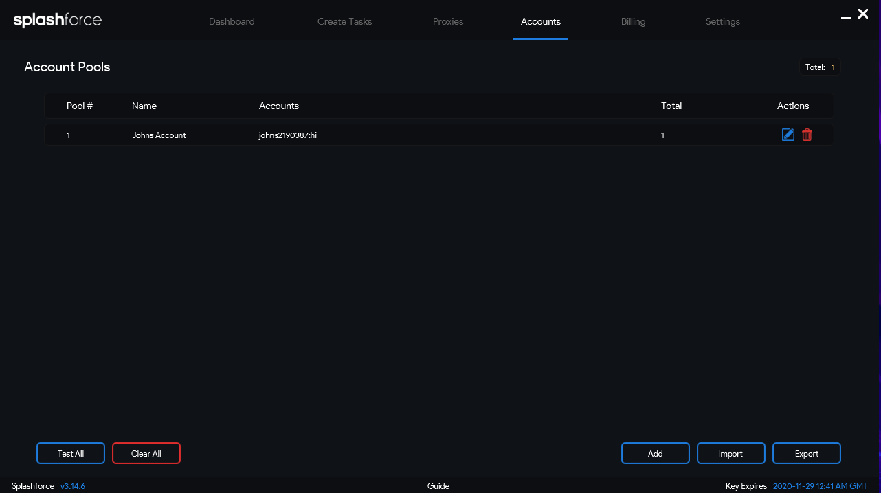 On this page you can view the account pools that you can create for specific support sites within bot which later can be used with your tasks. You can import your accounts if you have them stored within a file outside of Splashforce or you can export your accounts out of splashforce to a file to use elsewhere. You have the choice to test all your accounts too to ensure they work to avoid errors when you use them with your tasks.