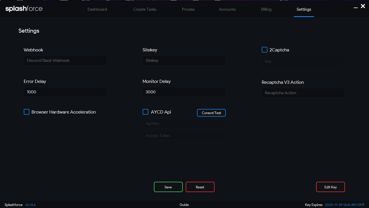 On the settings page you can configure a number of things that will affect your tasks on the dashboard page. You can change your delays which is based in MS and you can configure captcha related settings here if you wish. You can the option to edit your key meaning login with a different key than the one you already logged into and you can enter a webhook heere too.