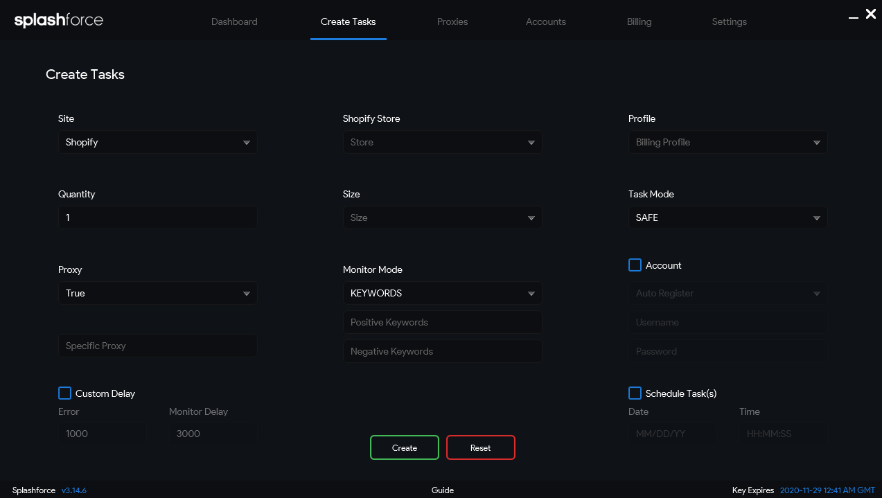 On this page you can create your tasks that will be viewed on the dashboard page. You can configure quite a few settings here however, this does adapt depending on what you select on the site dropdown. Across all site types you can use custom delays at the bottom too for that specific task without it affecting any other task you create. You can also schedule your tasks based on your local computer time and use custom delays at the bottom too for that specific task without it affecting any other task you create.