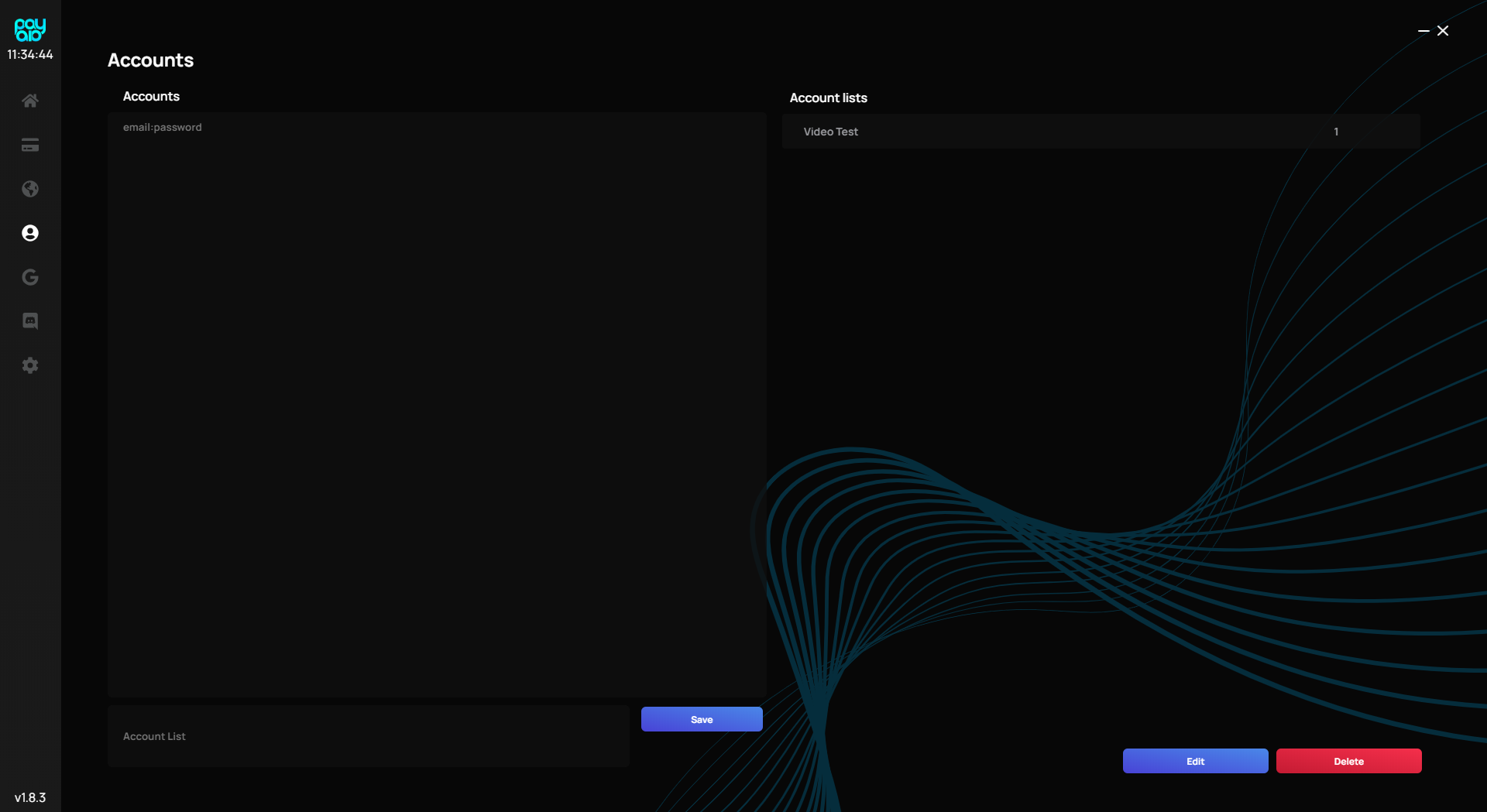 On this window within PayAIO, you can enter accounts that be used with your tasks. You enter the accounts in the formation email followed by the password and then you configure the account list. Once you create the list, the list will appear on the right side, you will be able to edit the account lists and delete them.