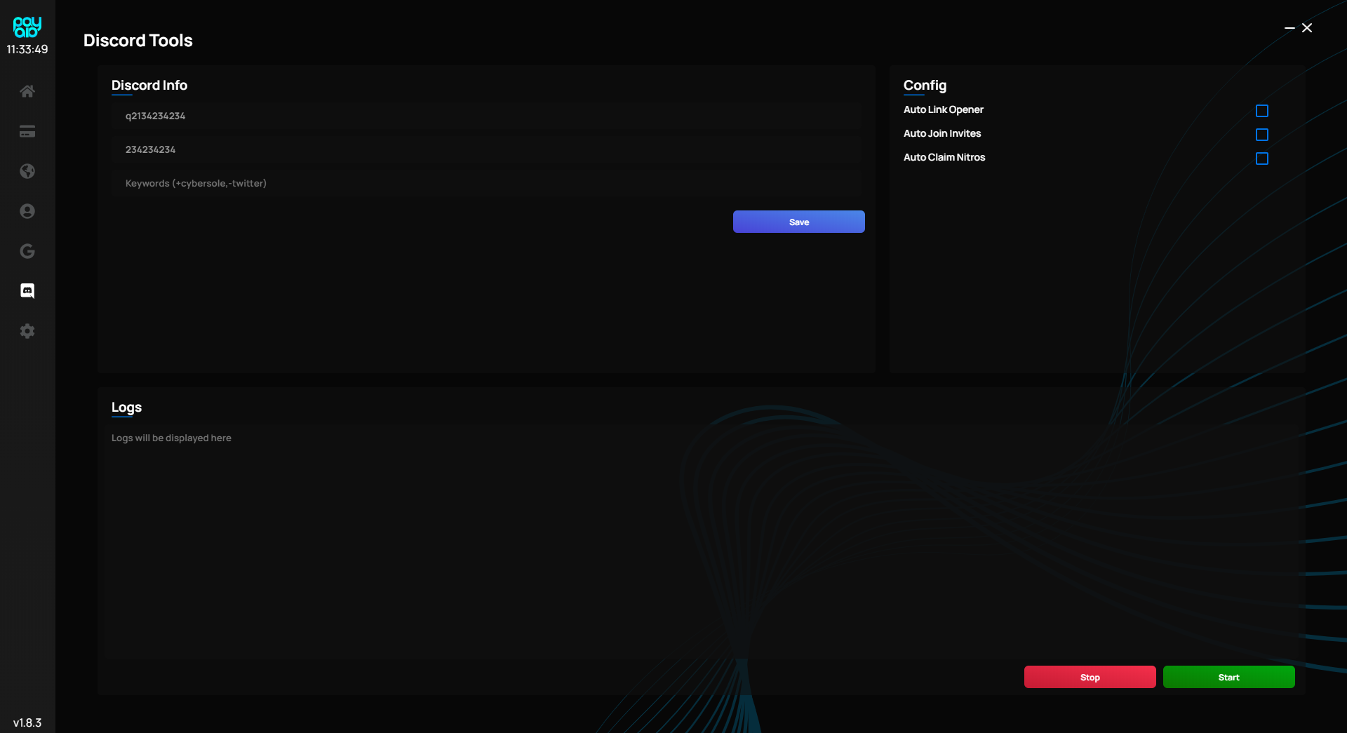On this window within PayAIO, you can manage the discord tools part of the application. You have the discord info section where you can edit the relevant information, below that you can view the logs of the tools. On the config section you can configure the auto link opener, auto join invites & auto claim nitros. Finally, you have the option to start and stop the tools at the bottom.