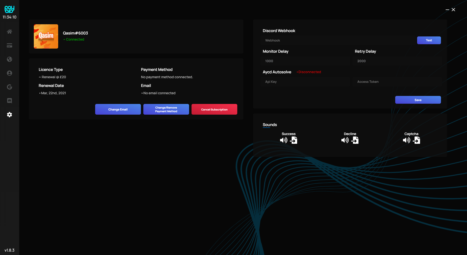 On this window within PayAIO, you can view the connected discord account, below that you can see some information regarding the license you are using. The license type, payment method, renewal date and email connected to the license will be displayed here. You have the option to manage this information which the three buttons in that box. On the right side, you can configure the delays, webhook and AYCD autosolve. Finally, you can configure the sounds that the bot makes.