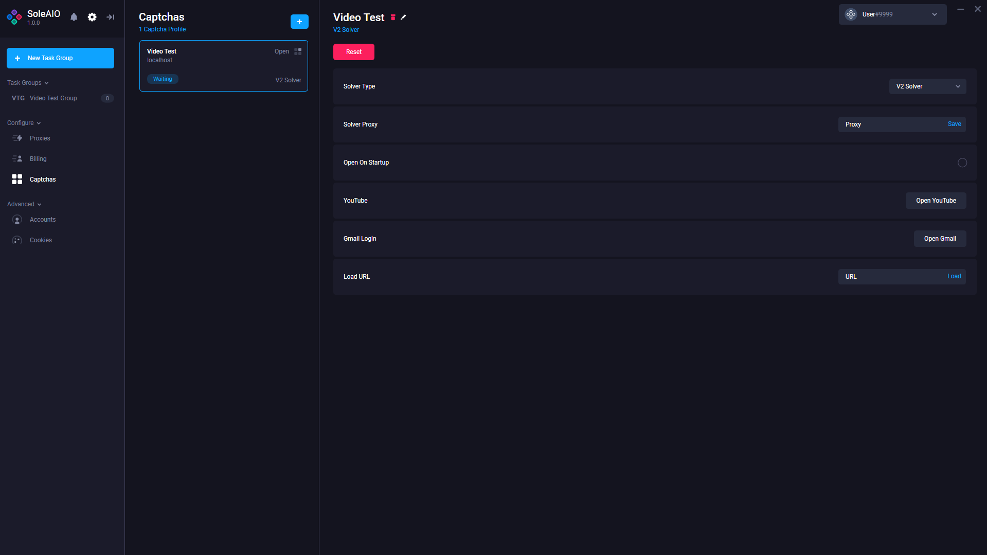 On this page within SoleAIO, you can manage your captcha harvesters that will be needed when running tasks. All captcha profiles will appear on the column and then once you select on one of the captcha profiles you can configure the settings for that profile. The settings you can configure is the solver type, solver proxy, whether you want it to open on startup, YouTube, gmail login and load URL to test your gmail accounts.