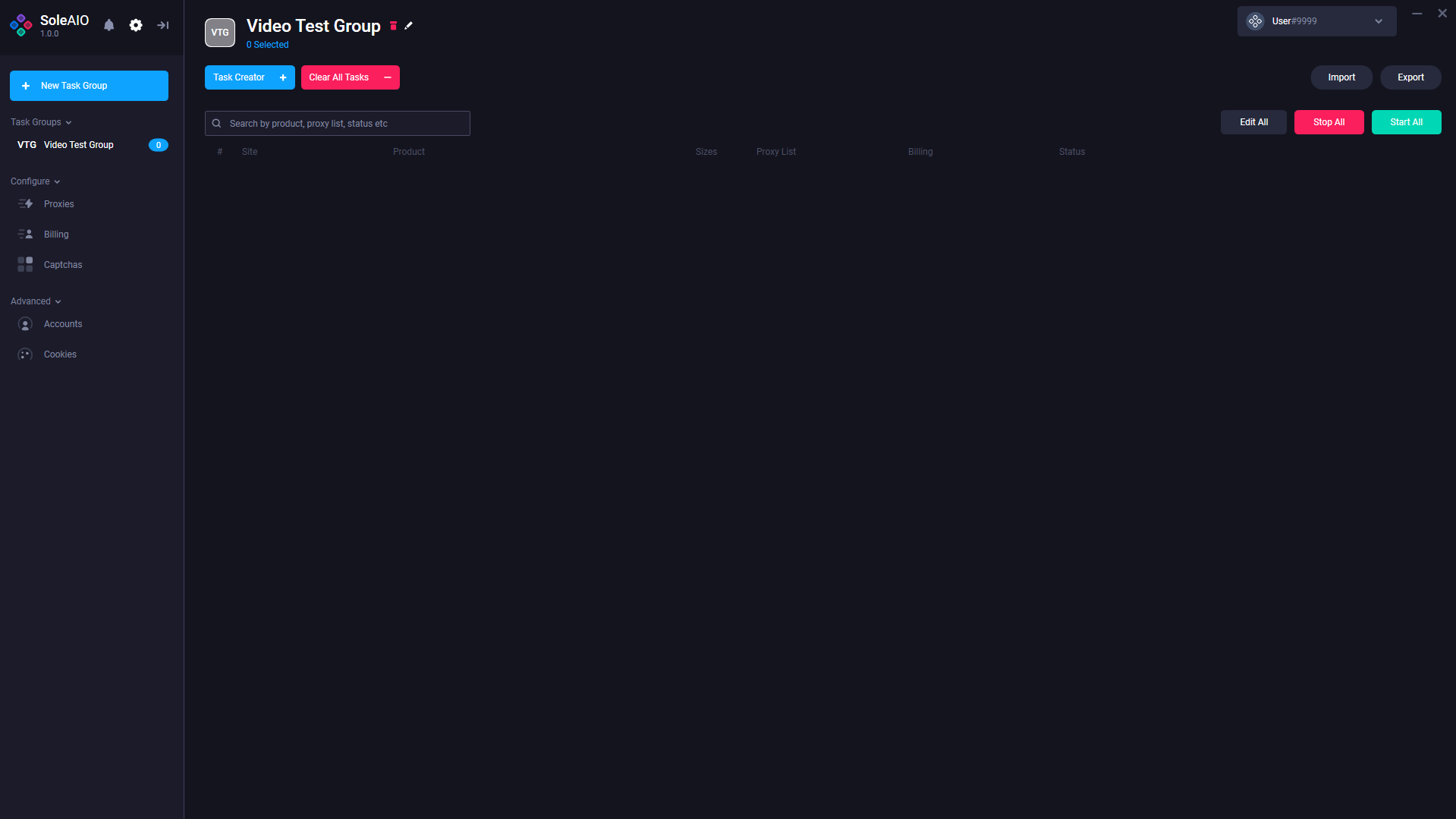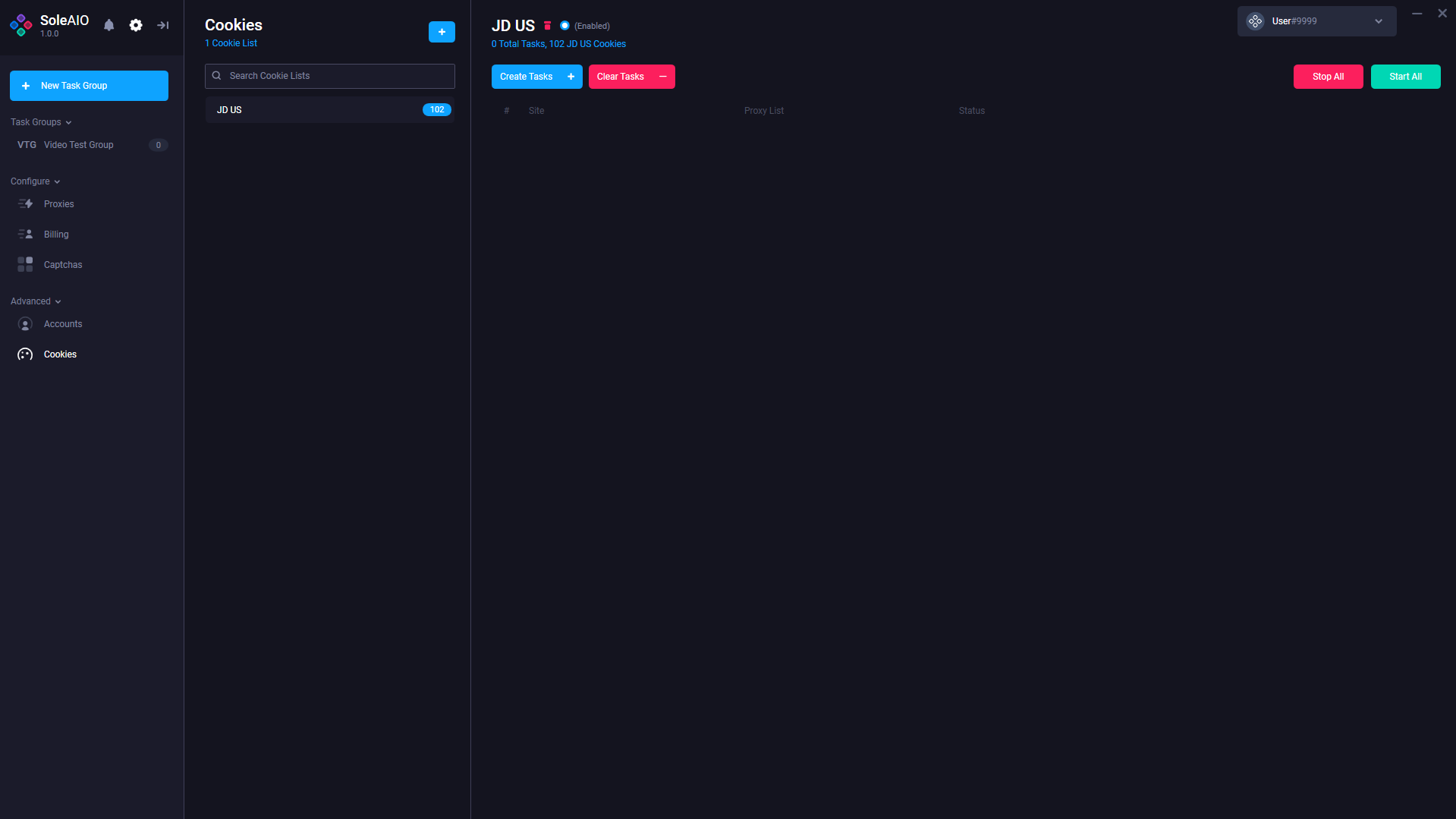 On this page within SoleAIO you can create cookie generator for different sites so they can be used with your tasks. You begin by creating a cookie list and once you select a site to generate cookies for, you can begin the generation process. When you create tasks they will be separated into the headers on the page and then they will begin generating cookies on the site you selected.