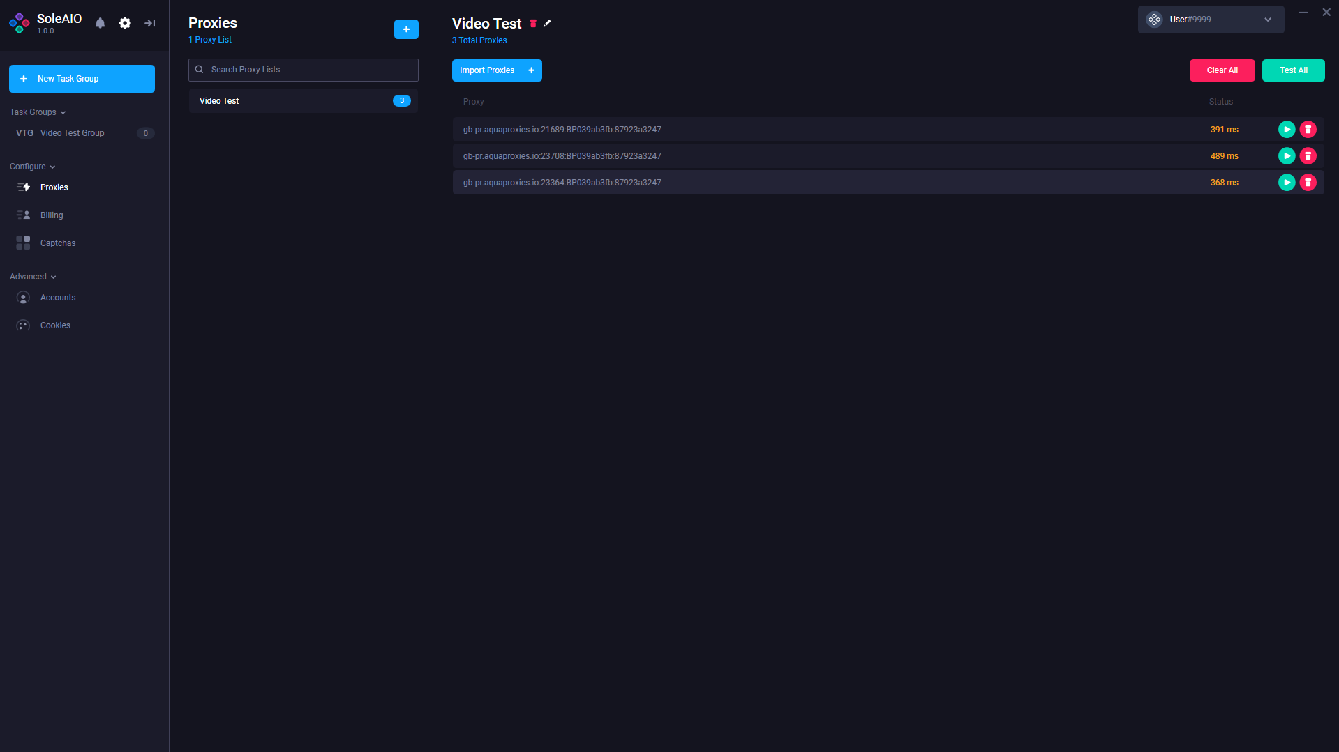 On this page you can add and view proxies to the bot so they can be used with your tasks. You can create a proxy list and that can be selected when making tasks, then on each list the proxies inside them will appear on the right side. For every proxy you can test their speeds and delete them if you wish, if you have a large amount of proxies you can collectively test them at the top of the page.