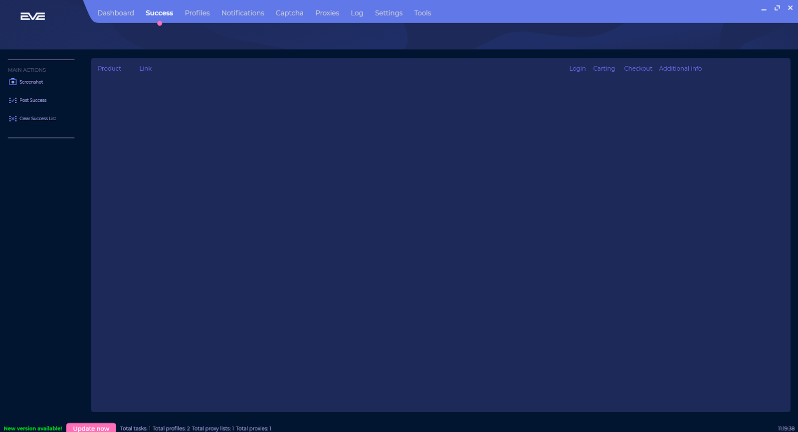 On this page within EVEAIO you can see all the success you attain through successful checkouts in the bot. On the success list it is segregated into headers which are the product, the link used in the checkout, whether a login was used, whether carting was used, the checkout associated with it and any additional information with the checkout.