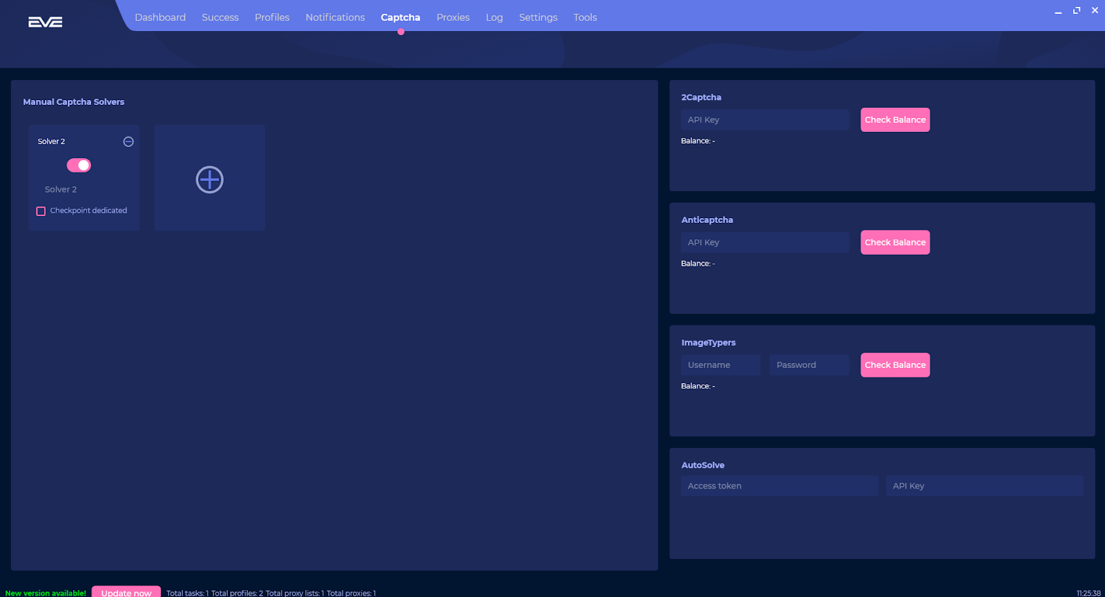 On this page within EVEAIO you can view all the captcha solvers that you have created and with that you can activate it to use with your tasks. You can add a captcha solver by clicking the addition button next to the existing captcha solvers. On the right side of the page you can enter API keys for 2captcha and anticaptcha but also utilize imagetypers by typing in your login details. These services will be used to solve captchas that come through your tasks and finally you can utilize autosolve if you wish.